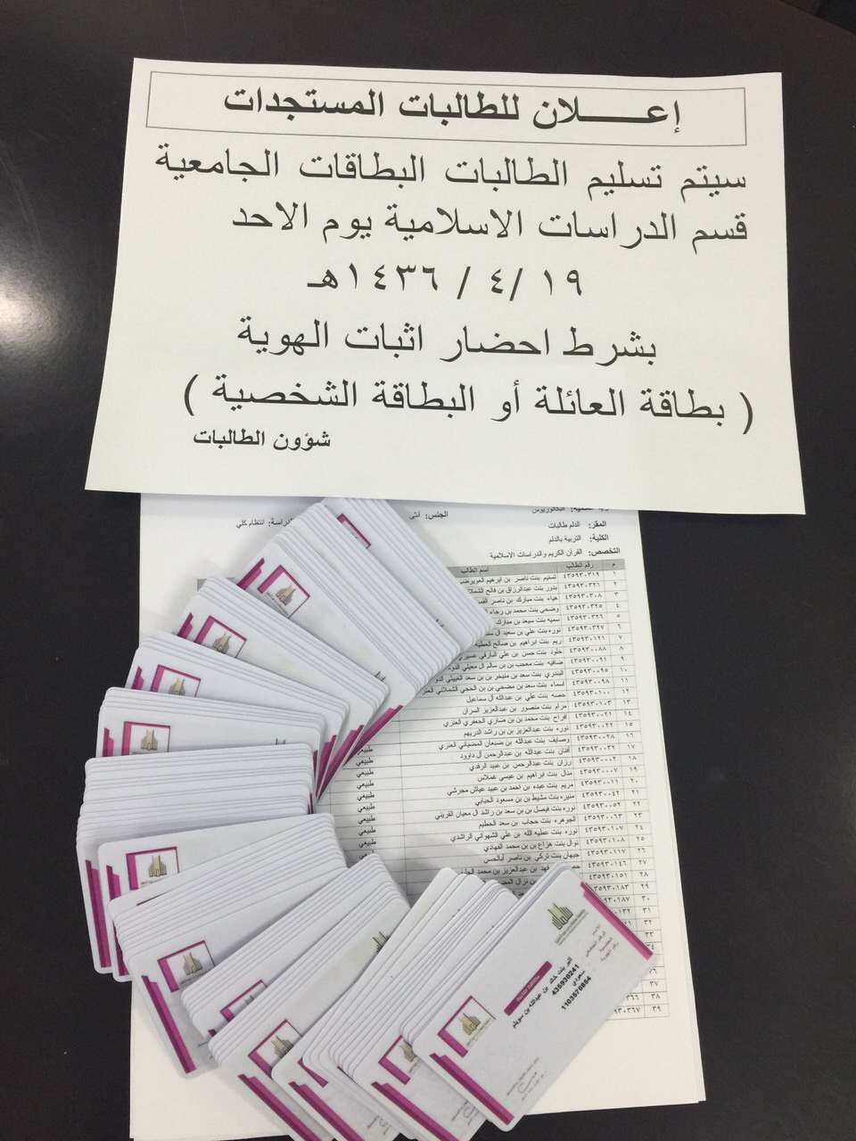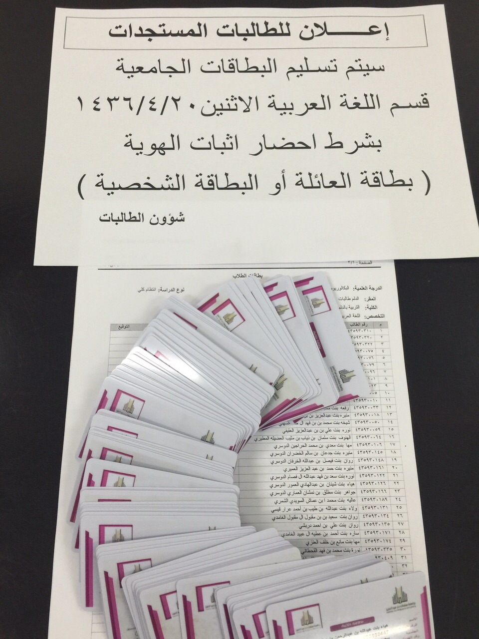 سلمت كلية التربية بالدلم البطاقات الجامعية للطالبات المستجدات للفصل الدراسي الثاني من العام الجامعي 1435/1436هـ بعد الإعلان عن موعد التسليم عن طريق نشر إعلانات داخل الكلية تبين مواعيد التسليم مع ضرورة إحضار إثبات الهوية ( سجل الأسرة أو البطاقة الشخصية ) .