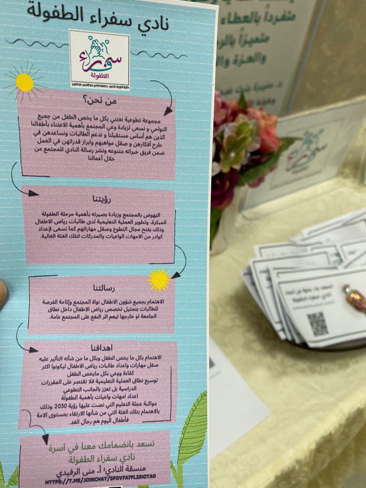 ومن هذا المنطلق حرصت كلية التربية بالخرج على دعم هذه الأندية وبرعاية كريمة دشنت اليوم الثلاثاء الموافق ٦ ربيع اول وكيلة الشؤون التعليمية الدكتوره منيرة بنت عبدالله العسكر الحمله التعريفية لبدء نشاط الأندية حيث تميزت كلية التربية بنادي سفراء الطفولة تحت أشراف الأستاذة منى الرفدي ونادي شغف بأشراف الاستاذه ساره الجديعي , ومن هذا المنطلق تحرص وحدة العمل الطلابي على اقامة النشاطات التي تبرز جهود أعضاء النادي في المجالات التي يتميزون فيها,, واكتشاف المواهب الطلابية ورعاية الموهوبين وتهيئة البيئة الملائمة للطلبة لتنمية قدراتهم ومهاراتهم وتبادل الخبرات فيما بينهم والعمل على تشجيعهم ودعمهم وتكريمهم، والمشاركة في المناسبات المختلفة داخلياً وخارجياً للاحتكاك وتبادل الخبرات.كما تضمنت الحملة، اركان تحتوي على توزيعات وبطاقات للتعريف بالنادي واهدافه والرؤية والرسالة ، وتم توزيع بطاقات التسجيل على الطالبات،،