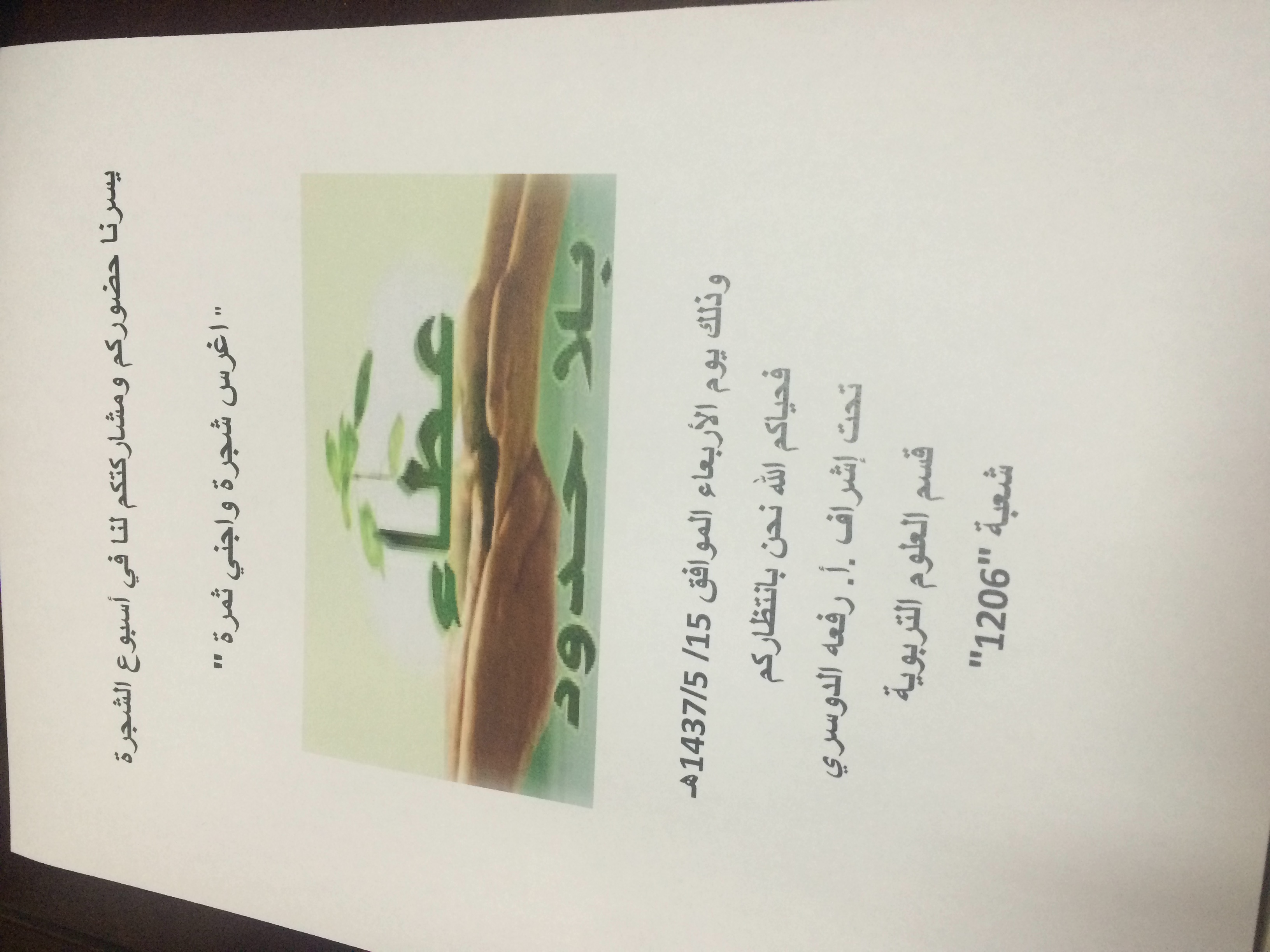 نظم قسم العلوم التربوية يوم الأربعاء 1437/5/15هـ حملة أسبوع الشجرة بعنوان "أغرس شجرة وأجني ثمرة" تحت إشراف الأستاذة /رفعة الدوسري انطلقت الحملة في حدود الساعة العاشرة والنصف وبدأت بعرض عن الشجرة وفوائدها وأنواعها وإقامة ركن يحتوي على كل مايخص الزراعة ومطويات ومنشورات عن الشجرة وبعد ذلك توجهت الأستاذة رفعة، ومسؤولة النشاط في القسم الدكتورة هدى الهذلي إلى ساحة الكلية مع عدد من .الطالبات وتم غرس عدد من الشتلات وسقايتها