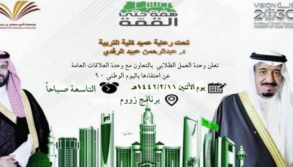 وبسبب الظروف الراهنة قامت وحدة العمل الطلابي بالتعاون مع وحدة العلاقات العامة بإقامة حفل افتراضي ( لليوم الوطني ) يوم الاثنين الموافق 11-2-1442ههـ،في تمام الساعة التاسعة صباحاً عبر برنامج زوم،حيث دُشن الاحتفال بحضور كل من وكيلات الكلية سعادة الدكتورة: منيرة العسكر وكيلة شؤون الطالبات و سعادة الدكتورة نورة الغملاس وكيلة الكلية للشؤون التعليمية والأكاديمية وبعض رئيسات الأقسام وعدد كبير من الهيئة التعليمية والإدارية وطالبات الكلية .