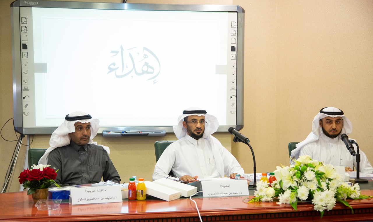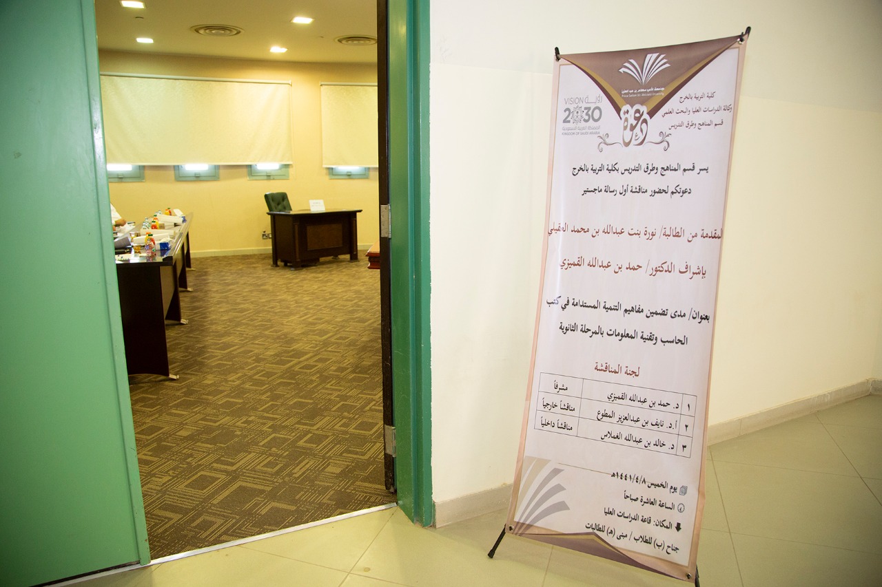 وقد أشرف على الرسالة الدكتور حمد بن عبدالله القميزي أستاذ المناهج وطرق التدريس المشارك بالقسم؛ وشارك في المناقشة أ.د. نايف المطوع أستاذ المناهج وطرق التدريس في جامعة شقراء ود. خالد الغملاس أستاذ الاتصال وتكنولوجيا التعليم المشارك بالقسم. وقد أوصت اللجنة بمنح الطالبة درجة الماجستير في المناهج وطرق التدريس العامة؛ كما أوصت الباحثة بمواصلة التعليم والتعلم والاستفادة مما تعلمته في حياتها العلمية والعلمية.