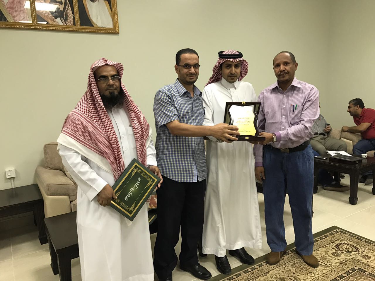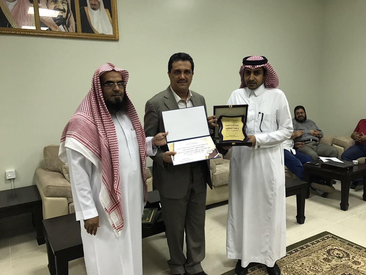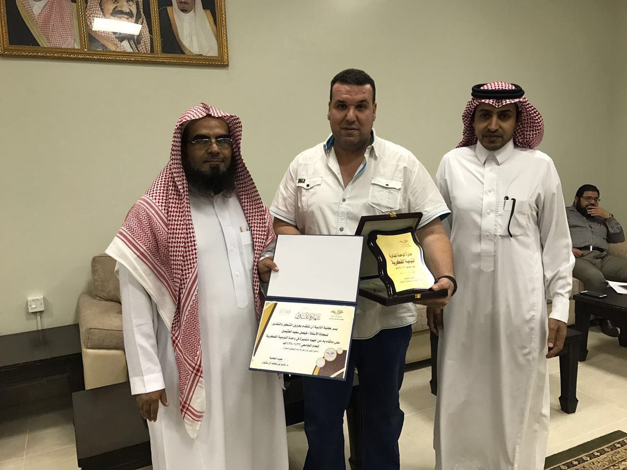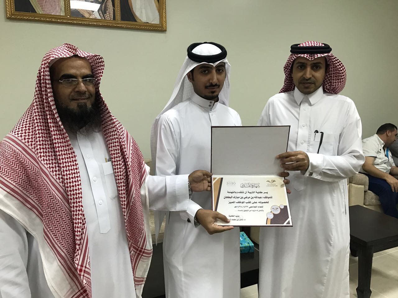 فيما حصل الموظف عبدالله مرضي بطحان على شهادة شكر وتقدير من العميد كونه الموظف المتميز للعام الجامعي 1438/1437 هـ