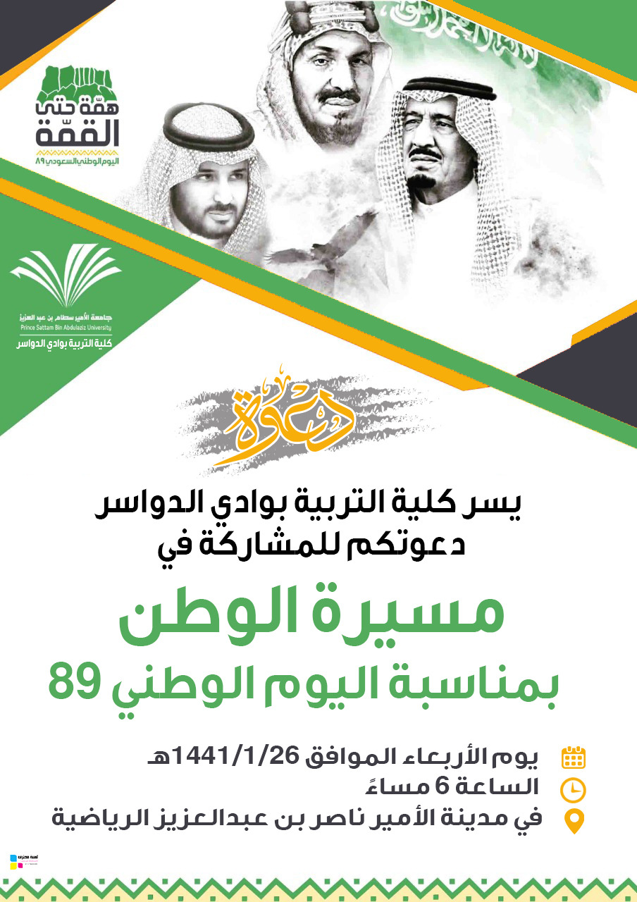 تنظم كلية التربية بوكالة جامعة الأمير سطام بن عبدالعزيز بوادي الدواسر اليوم الأربعاء الموافق 1441/1/26 هـ مسيرة وطنية بمدينة الأمير ناصر بن عبدالعزيز الرياضية ضمن فعالياتها بمناسبة اليوم الوطني الـ89 للملكة العربية السعودية تحت شعار «همة حتى القمة» ، بحضور عدد من القيادات للدوائر الحكومية بالمحافظة وعمداء كليات وادي الدواسر والمواطنين ، وسنتطلق المسيرة في تمام الساعة السادسة مساءً على ملعب الأمير ناصر بن عبدالعزيز الرياضية بوادي الدواسر .