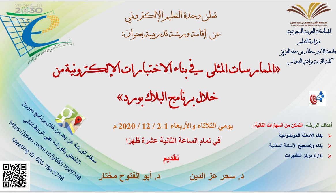 أقامت وحدة التعليم الإلكتروني بكلية التربية بوادي الدواسر برنامجًا تدريبيًّا لأعضاء هيئة التدريس تحت عنوان "الممارسات المُثلى لبناء الاختبارات المقالية والموضوعية على نظام البلاكبورد" والذي تم تقديمه على مدى ثلاثة أيام، الثلاثاء والأربعاء الموافق 16-17 /4/ 1442هـ والأحد الموافق 21 / 4 / 1442هـ.