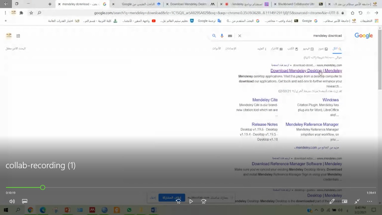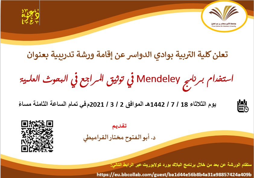 في إطار نشر ثقافة التعليم الإلكتروني والتعليم عن بعد بالجامعة أقامت كلية التربية بوادي الدواسر ورشة تدريبية لأعضاء وعضوات هيئة التدريس وطلاب الدراسات العليا بالفروع تحت إشراف وحدتي التعليم الالكتروني والبحث العلمي بعنوان " استخدام برنامج Mendeley في توثيق المراجع في البحوث العلمية" والتي تم تقديمها اليوم الثلاثاء 18 / 7 / 1442هـ الموافق 2 / 3 / 2021م في تمام الساعة الثامنة مساءً عبر برنامج الزووم .