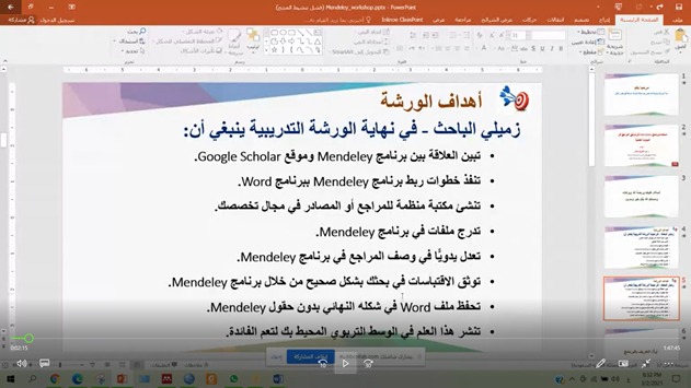 وتأتي مثل هذي الورش بتوجيهات عميد الكلية الدكتور/ ماجد بن علي الشريدة لتفعيل خطة الكلية في صقل المهارات التقنية لمنسوبي الجامعة بكليات الفروع، وانطلاقًا لتفعيل التعاون المثمر بين كليات فروع جامعة الأمير سطام بن عبد العزيز، فيما يتعلق بالتدريب على الميزات المتقدمة في التقنيات الحديثة في مجال التعليم والبحث العلمي، وقام بتقديم الورشة سعادة الدكتور/ أبو الفتوح مختار القراميطي عن بعد من خلال منصة البلاك بورد، واستهدفت الورشة تدريب أعضاء هيئة التدريس وطلاب الدراسات العليا على الاستخدام الأمثل لبرنامج Mendeley في توثيق البحوث العلمية، وكيفية الربط بين ميزات البرنامج والاستفادة من البحوث المنشورة في قواعد البيانات العالمية؛ وذلك تيسيرًا لإجراء بحوث تنافسية للنشر في المجلات الدولية والمصنفة ضمن قواعد البيانات العالمية مثل Scopus، ISI.