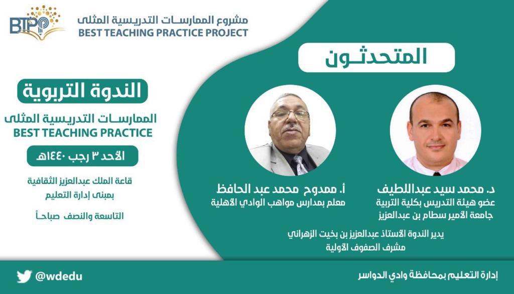 فى إطار الشراكة المجتمعية والتعاون المستمر بين كلية التربية وإدارة التعليم بوادي الدواسر لدعم وتطوير العملية التعليمية ؛ شاركت كلية التربية خلال تدشين إدارة التعليم بالمحافظة لمشروع (الممارسات التعليمية المثلى) بندوة تثقيفية بمسرح الملك عبد العزيز بمبنى إدارة التعليم، وذلك يوم الأحد الموافق 3 / 7 / 1440 هـ. قدمها د. محمد سيد عبد اللطيف أستاذ علم النفس التربوي المشارك بالكلية.