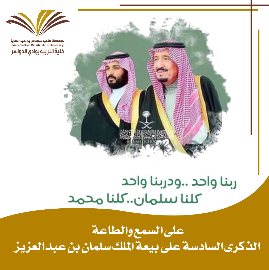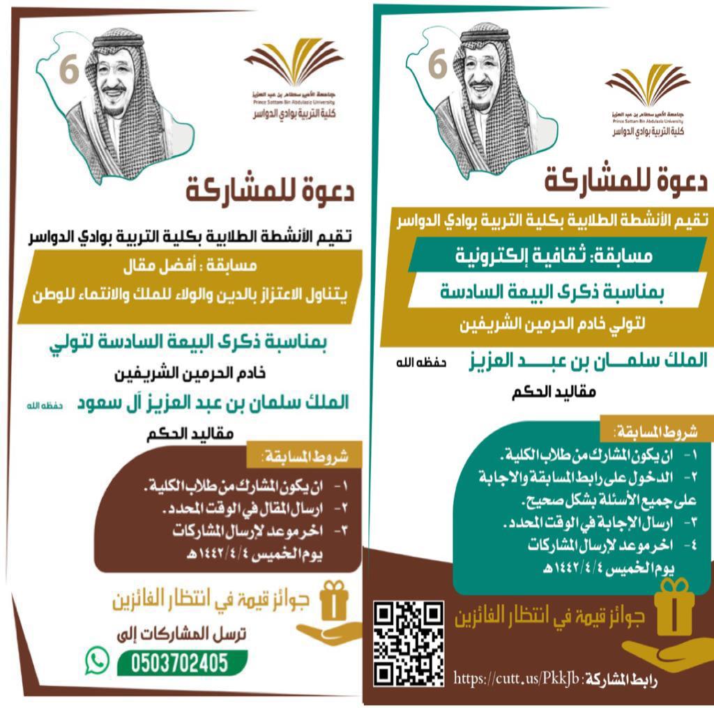 تعلن كلية التربية بوادي الدواسر ممثلة بوحدة الأنشطة الطلابية عن إطلاق مسابقة لأفضل مقال يتناول الاعتزاز بالدين والولاء للملك والانتماء للوطن ، بمناسبة ذكرى البيعة السادسة لتولي خادم الحرمين الشريفين الملك سلمان بن عبدالعزيز ال سعود مقاليد الحكم .