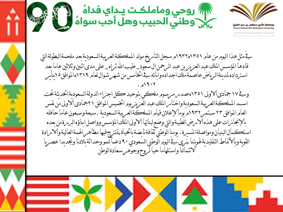 تحت شعار (همة حتى القمة) أقامت وحدة العمل الطلابي بكلية التربية بوادي الدواسر ـ قسم الطالبات ـ في يوم الثلاثاء الموافق 22/ 9 / 2020م احتفالاً بالذكرى التسعين ليوم خُلدت فيه ملحمة تاريخية لتوحيد المملكة العربية السعودية على يد الملك عبد العزيز بن عبد الرحمن آل سعود -طيب الله ثراه-