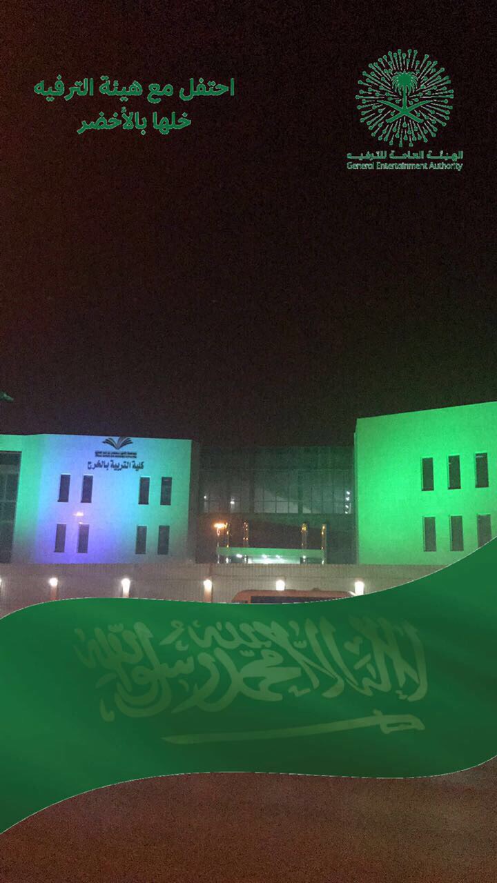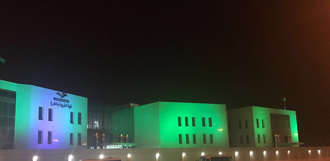 في لفته وطنية وتربوية من وحدة العمل الطلابي بكلية التربية للبنات بالخرج اكتسى مبنى الكلية باللون الأخضر وتميز كحجر الزمرد احتفالاً باليوم الوطني المجيد السابع و الثمانون للمملكة العربية السعودية.