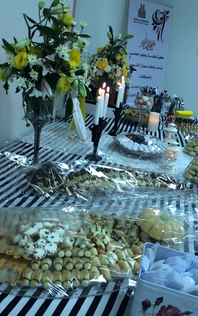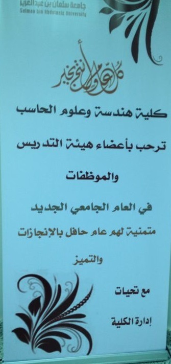 الهنوف الشغرود – كلية هندسة وعلوم الحاسب : أقامت إدارة كلية هندسة وعلوم الحاسب بالخرج "أقسام الطالبات" صباح اليوم الأربعاء حفل استقبال ومعايدة لعضوات هيئة التدريس والموظفات في العام الجامعي الجديد 1435/1436هـ بقاعة الاستقبال في مقر الكلية.