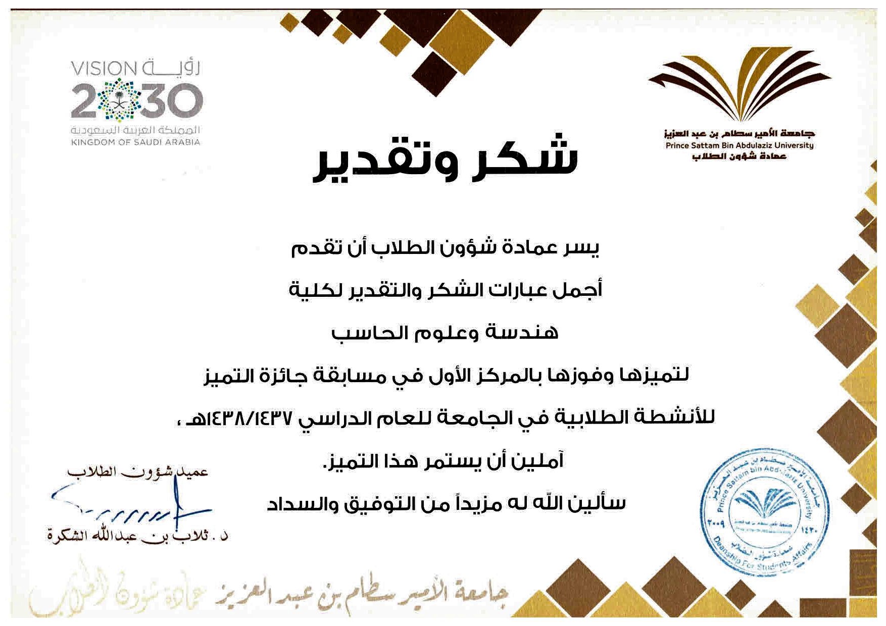وكذلك شكر سعادة العميد باسمه ونيابة عن جميع الفريق المكلف بالأنشطة الطلابية سعادة الدكتور ثلاب الشكره وجميع الزملاء في عمادة شؤون الطلاب على دعمهم وتوجهيهم ومساندتهم للأنشطة الطلابية بالكلية.