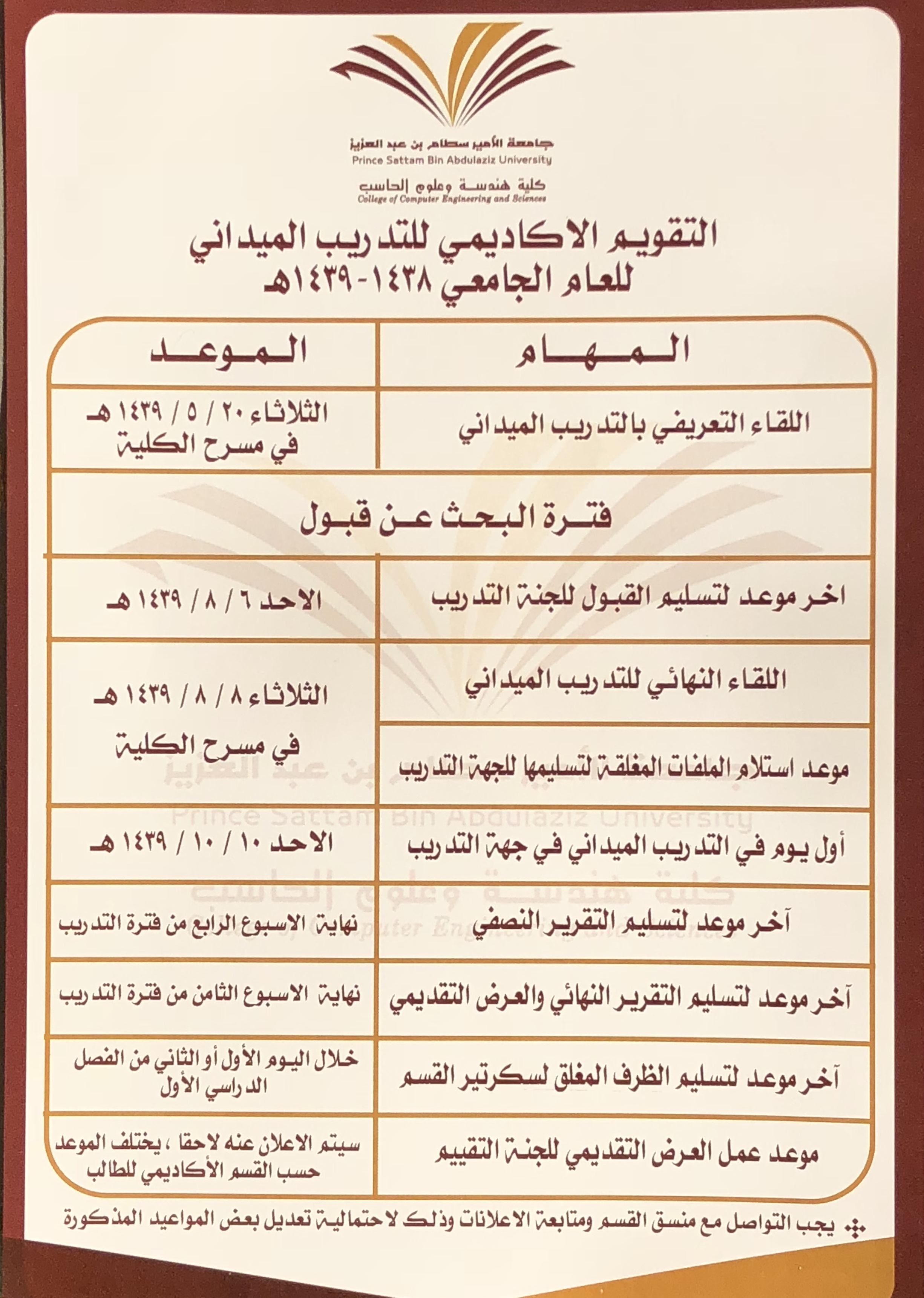 وتم التأكيد على الطلاب بأن اخر موعد لتسليم قبول التدريب لمنسقي الأقسام هو يوم الأحد الموافق 1439/08/06هـ وأن موعد اللقاء النهائي للتدريب الميداني هو يوم الثلاثاء الموافق 1439/08/08هـ، وتكون المباشرة في جهة التدريب يوم الأحد الموافق 1439/10/10هـ.