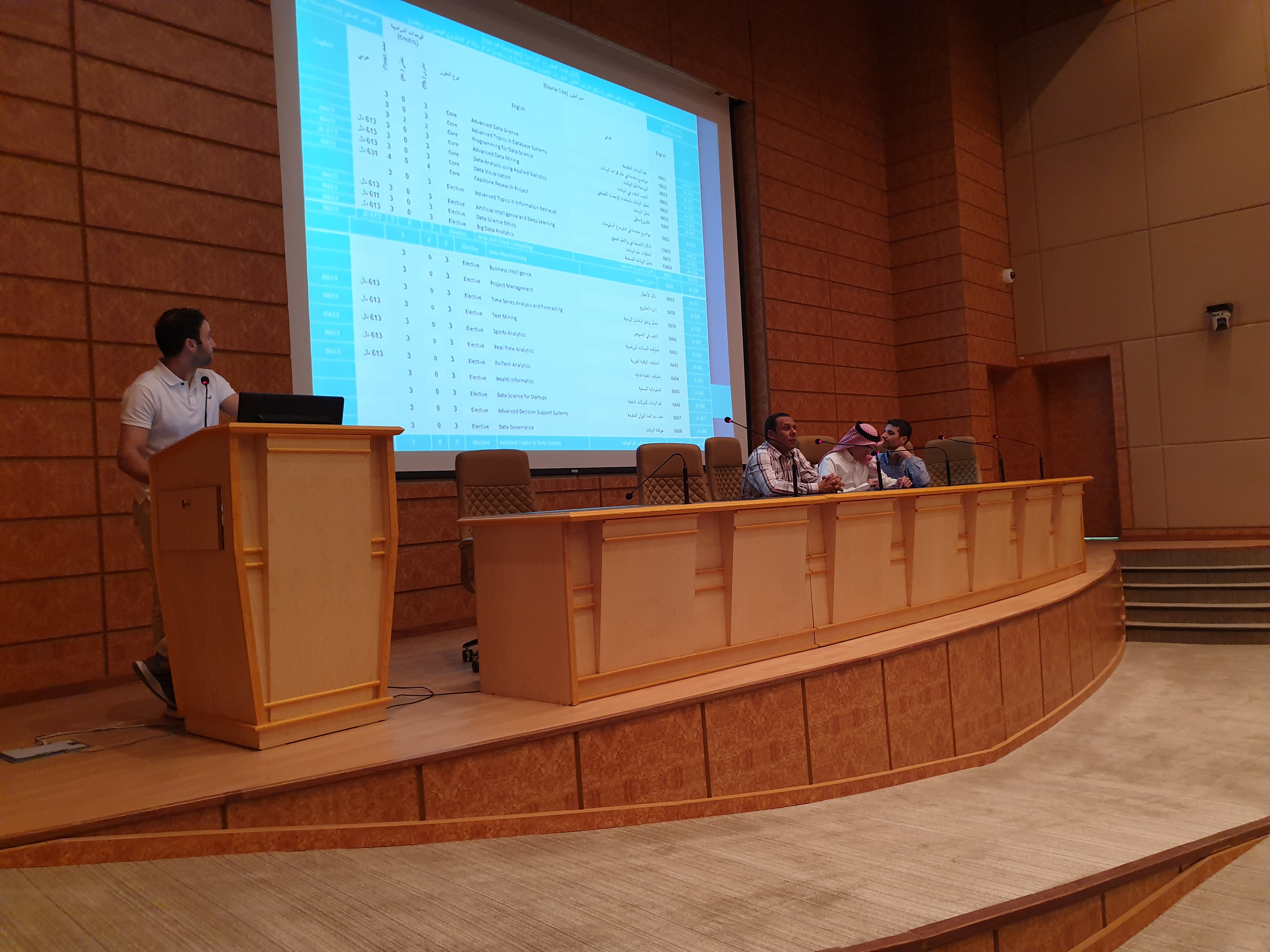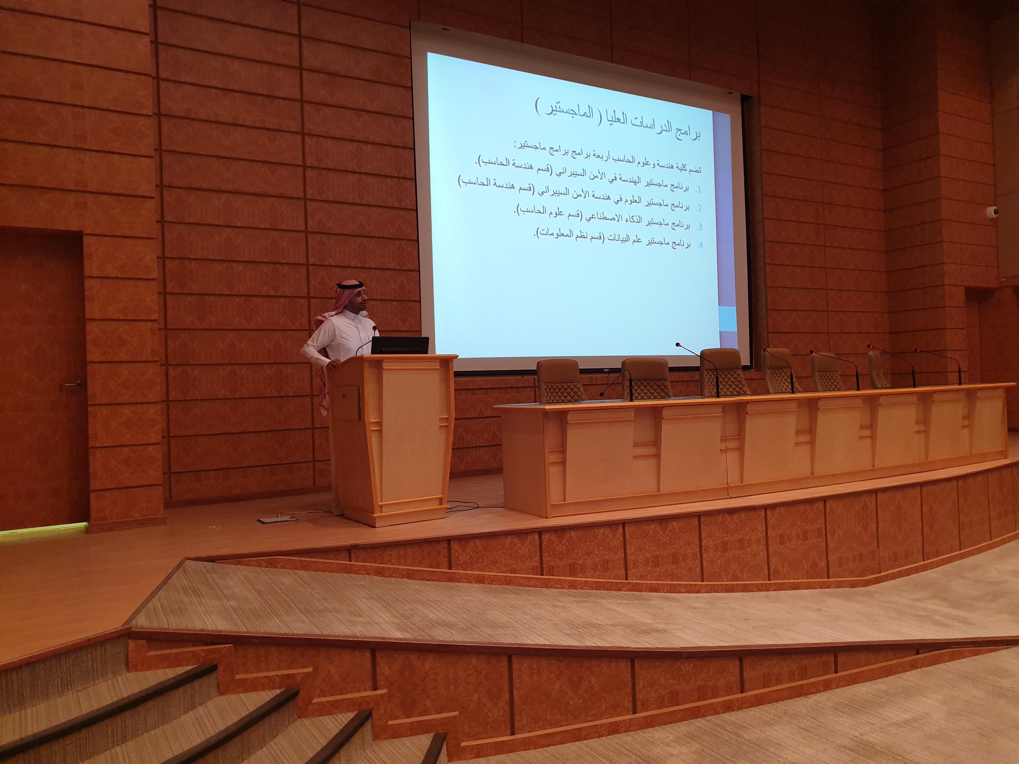 كما تناول كلاً من الدكتور عاطف إبراهيم ممثلا عن قسم هندسة الحاسب تفاصيل برنامج ماجستير الهندسة في الأمن السيبراني والدكتور علي اللواتي ممثلاً عن قسم نظم المعلومات تفاصيل برنامج ماجستير علم البيانات والدكتور أحمد عسيري ممثلاً عن قسم علوم الحاسب تفاصيل برنامج ماجستير الذكاء الإصطناعي وذلك من خلال تقديم عرض مرئي مفصل عن البرامج وعن مراحل الدراسة وآلياتها ومواعيدها.