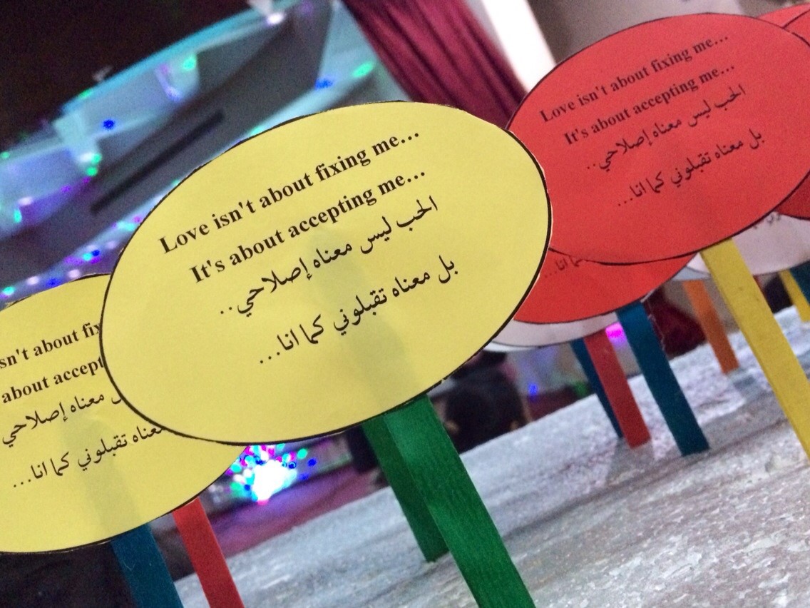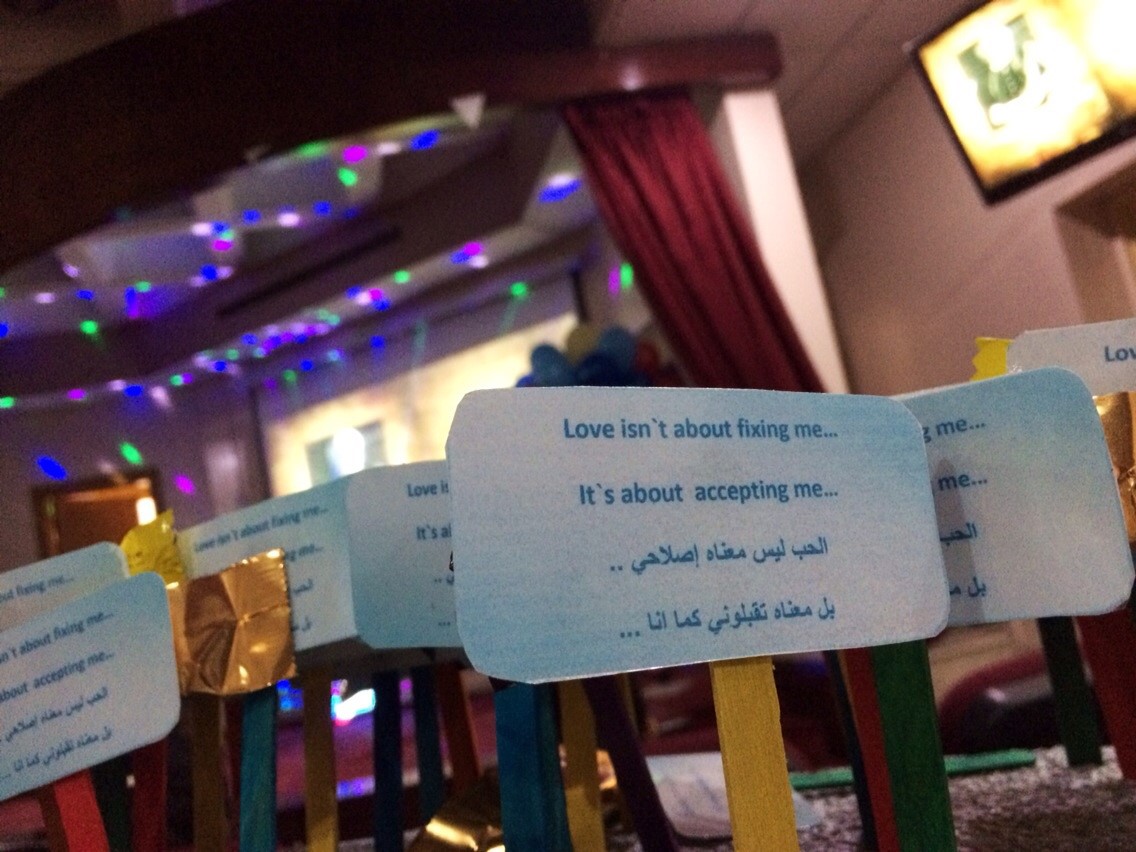 بدأ البرنامج بأنشودة معبرة عن مرض التوحد، تلتها مقدمة تعريفية عن مرض التوحد ، وماهي متلازمته وأسبابه وهل هو اضطراب أو تخلف ،بعدها تم عرض فيديو تعريفي تناول أعراض التوحد ثم نماذج صور لأطفال التوحد باللغة الإنجليزية ، تلتها شخصيات من المشاهير المصابين بهذا الاضطراب تلا ذلك بيان دور الأسرة والمجتمع المحلي تجاه هذا المرض وقدم العرض باللغة العربية والإنجليزية ،بعدها تم تلاوة آيات قرآنية وأحاديث نبوية شريفة عن الابتلاء، وشارك الحضور بكتابة الآراء والتعليقات الحرة.