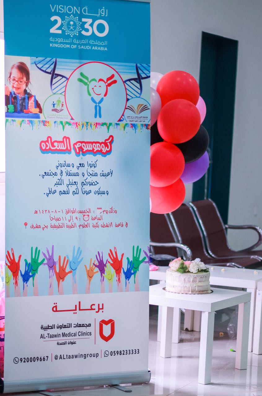 أقام نادي العلاج الطبيعي بكلية العلوم الطبية التطبيقية – أقسام الطالبات – يوم الخميس الموافق 8/1/ 1438هـ بإشراف الدكتورة نادية لطفي رضوان (مشرفة النادي) فعالية بعنوان " كروموسوم السعادة لأطفال متلازمة داون " والذين تم استضافتهم من مركز السيح ومركز روح الادارة بمحافظة الخرج وقد حضر إلى مقر الكلية 23 طفل وطفله بمرافقة المشرفات وبعض أمهات الأطفال .