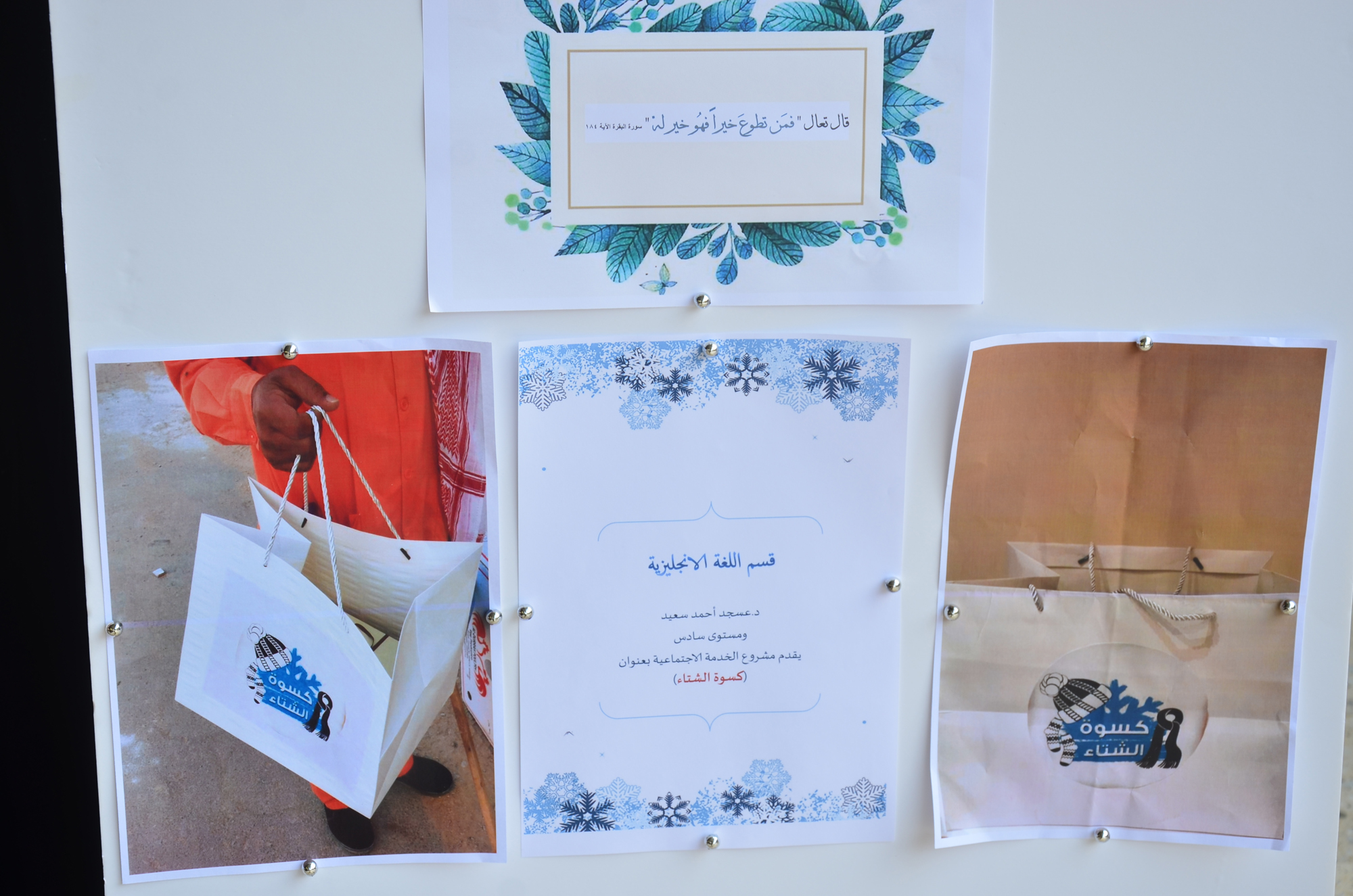 في مبادرة إجتماعية نظم قسم اللغة الإنجليزية بكلية العلوم والدراسات الإنسانية بالأفلاج ( شطر الطالبات ) قُمن طالبات القسم بعمل كسوة الشتاء امتثلاً لحديث رسولنا الكريم عليه افضل الصلاة والسلام [ مثل المؤمنين في توادهم و تراحمهم و تعاطفهم كمثل الجسد إذا اشتكى منه عضو تداعى له سائر الجسد بالسهر والحمى ] ، حيث يهدف النشاط الى زع روح المحبة والتآخي في نفوس الطالبات .