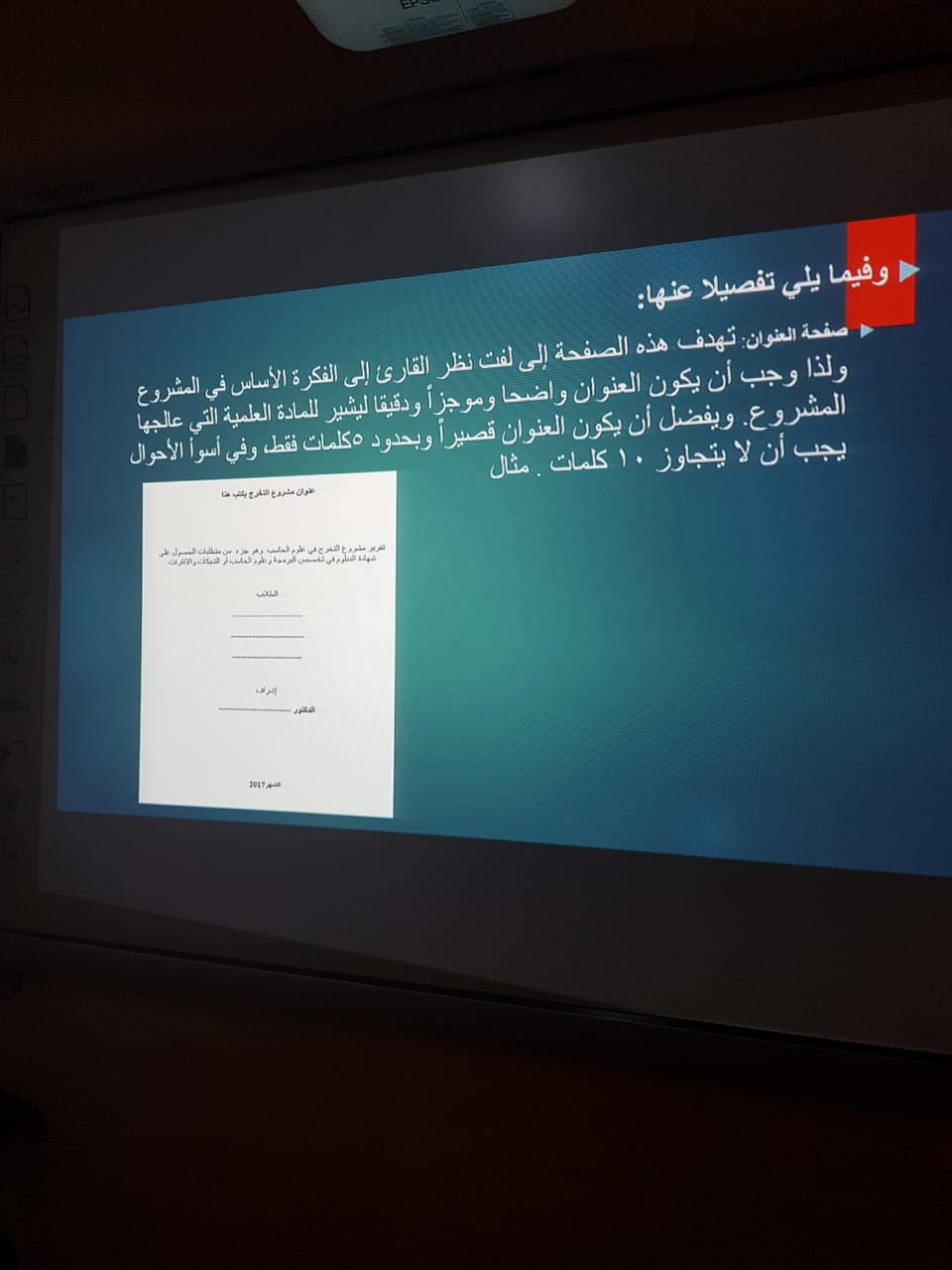 حيث تهدف المحاضرة لتعريف الطالبات بمشروع التخرج وكيفية كتابته حيث تم تعريف الطالبات بالصيغة الفنية لكتابة التقرير من حيث البرنامج المستخدم لكتابة التقرير ونوع الخط وحجمه والهوامش وطريقة ترقيم الصفحات وكيفية عمل جدول المحتويات والجداول والرسوم، ثم أوضحت الأستاذة سناء عزام كيفية تنظيم المشروع من حيث الأجزاء وكل جزء كيفية كتابته كما تم تسليم نسخه من دليل كتابة المشروع لكل مجموعة، وقد شهدت المحاضرة تفاعل كبير من الطالبات حيث طرحن بعض الأسئلة المتعلقة بالمحاضرة وناقشن أهم المحاور التي طرحت فيها.