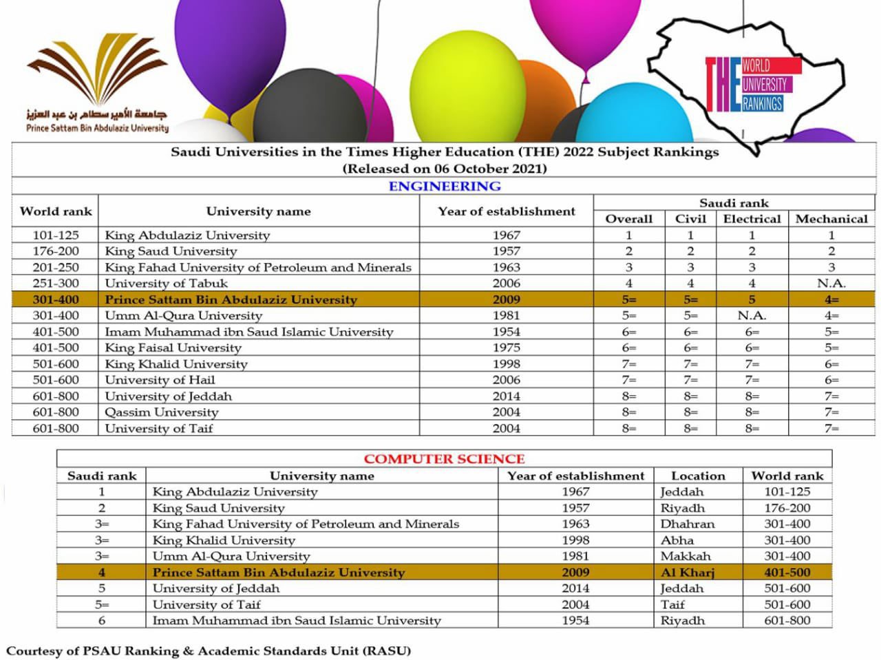 حققت كُلِّيتا الهندسة وهندسة وعلوم الحاسب بجامعة الأمير سطام بن عبدالعزيز بالخرج مراكز متقدمة في تصنيف التايمز العالمي حيث حلت كلية الهندسة ضمن التصنيف العالمي في المرتبة 301-400 والمرتبة الخامسة على مستوى الجامعات السعودية ، فيما حلت كلية هندسة وعلوم الحاسب ضمن التصنيف العالمي في المرتبة 401-500 والمرتبة الرابعة على مستوى الجامعات السعودية. جاء ذلك بعد إعلان موقع تصنيف التايمز العالمي والذي يُعنى بتصنيف وتقييم الجامعات بشكل سنوي حيث يخضع لعدة معايير يعتمد من خلالها التصنيف بعد تقييمها من قبل خبراء متخصصين في جهات محايدة بناء على دراسة بيانات أداء الطلاب والطالبات وأعضاء هيئة التدريس إضافة إلى تقييم بيئة التعليم الأكاديمية للجامعة والتجهيزات التقنية الملائمة ومستوى البحوث العلمية والمشاريع البحثية والمجتمعية ومدى تأثيرها. يأتي ذلك التقدم انطلاقاً من سعي وحرص الجامعة على استخدام المنهجية العلمية القائمة على التفكير الاستراتيجي لصناعة مستقبلها وتوفير العوامل التي تجعلها مصدراً رائداً في التميز وتقديم رحلة تعليمية متكاملة في شتى المجالات الأكاديمية والبحث العلمي والابتكار بما يتواءم مع مستهدفات رؤية المملكة العربية السعودية 2030م.