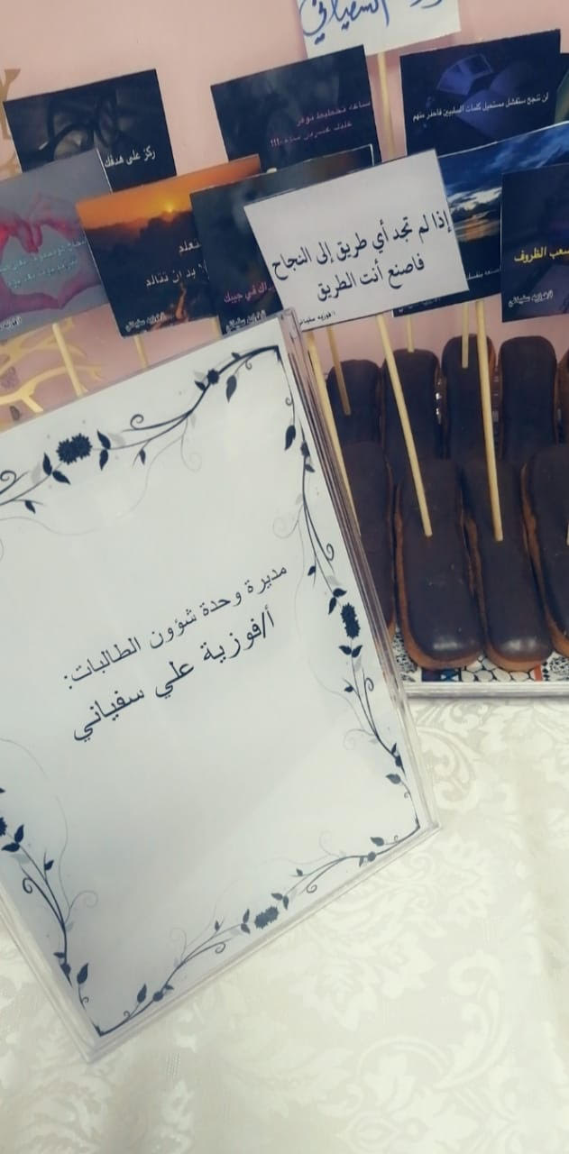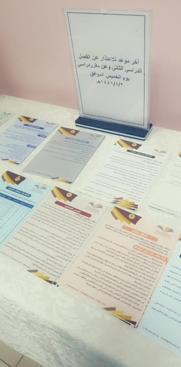 كما تم وضع ركن من قبل وحدة شؤون الطالبات ووحدة التوجيه والإرشاد يحتوي على توزيعات تهم الطالبة تختص بالحذف والإضافة والإنذار والفصل الأكاديمي والفصل الصيفي والاعتذار عن الفصل الدراسي والتنويه على آخر وقت للاعتذار كما تمت الاجابة على استفسارات الطالبات.