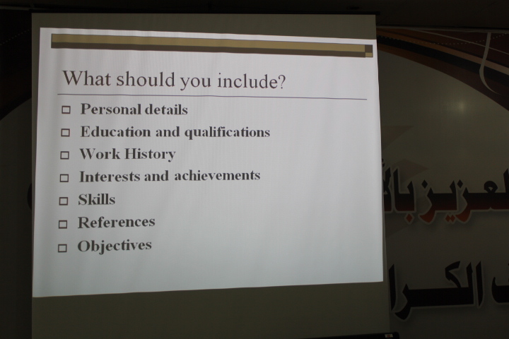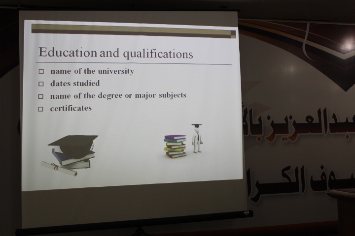 قامت وحدة الخريجات (الإرشاد المهني) بكليات الأفلاج (قسم الطالبات) يوم الثلاثاء الموافق 1441/6/24هـ الساعة التاسعة صباحاً في المسرح بتنظيم دورة بعنوان (كيف أكتب سيرتي الذاتية بنجاح) قدمتها د. بتول أحمد عمر، تهدف الدورة إلى إكساب الطالبات مهارة كتابة السيرة الذاتية بنجاح، حيث أوضحت معنى السيرة الذاتية وكيفية إعدادها بطريقة احترافية جذابة لجهة التوظيف، كما بيّنت أهمية خطاب التعريف و الحصول على الخبرات والدورات والاستزادة من المهارات، واختتمت الدورة بالإجابة عن استفسارات الطالبات.