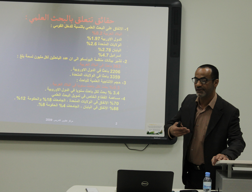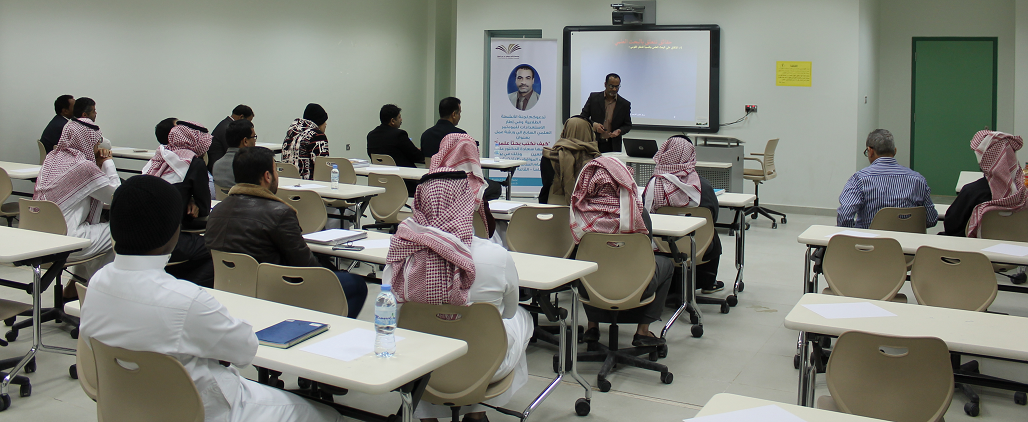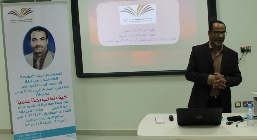 أقامت كلية إدارة الأعمال ورشة عمل حول كيفية كتابة بحث علمي، برعاية عميد الكلية وفي إطار الاستعدادات للمؤتمر العلمي السابع لطلاب وطالبات التعليم العالي بالمملكة؛ أدار الورشة الدكتور فخر الدين موسى محمد عثمان ، منسق الكلية للمؤتمر العلمي السابع ، وتحدث فيها الدكتور علاء محمد ملو العين ، رئيس قسم المحاسبة ، مستهلاً حديثه باستعراض الوضع الراهن للبحث العلمي بالمنطقة العربية والمملكة ، ومن ثم استعرض آلية ومهارات البحث العلمي ابتداء من عنوان الدراسة مع ملاحظة أن عنوان الدراسة هو أول ما تقع عليه عين القارئ، ومن هنا تبرز أهميته مشيرًا لوجود كثير من الدراسات ذات قيمة علمية ولكن يُقلل من قيمتها عدم تناسب عنوانها مع محتواها. مشددا على أن الباحث يجب أن يحسن اختيار عنوان دراسته، وأن يصيغه صياغة دقيقة وسليمة.