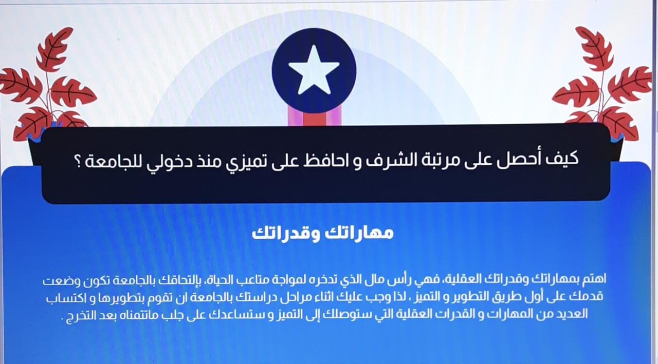 نظم نادي العلوم الأساسية بعمادة السنة التحضيرية -قسم الطالبات، محاضرة بعنوان" كيف تستعد لسنة الامتياز " يوم الأحد الموافق 1443/3/4هـ، باشراف أ.رجاء عبد الفتاح ،أ. راضية حميدي وبحضور منسوبات العمادة وطالباتها، تسعى المملكة العربية السعودية للنهوض بالتعليم الجامعي وتحسين جودته من خلال بناء منظومة تعليمية ترتبط باحتياجات سوق العمل, وبالتالي سد االفجوة التي قد توجد بين كل من مخرجات التعلم ومتطلبات سوق العمل وبذلك كانت مرتبة الشرف منحة تكريمية للطالب المتفوق بالمرحلة الجامعية لتشجيع الطلاب على التميز والتفوق والنجاح.