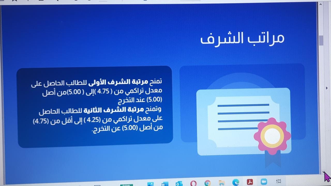 تحدثت الطالبات عن مراتب الشرف وشرط الحصول عليها وكيفية الحصول عليها بعدم الغياب عن المحاضرات ووضع الخطط للدراسة وعدم ضياع الوقت ومراجعة الدروس أول بأول وعدم التسويف وتعلم ادارة الأزمة والابتعاد عن الأشخاص المحبطين ثم ذكرت الطالبات بعض النصائح للوصول الى مرتبة الشرف. و اختتمت المحاضرة بكلمه من أ.راضية أ. رجاء شكرن فيها جميع الحضور والطالبات على جهودهن المتميزه والملحوظة. وتمنت لهن مزيدا من الابداع.