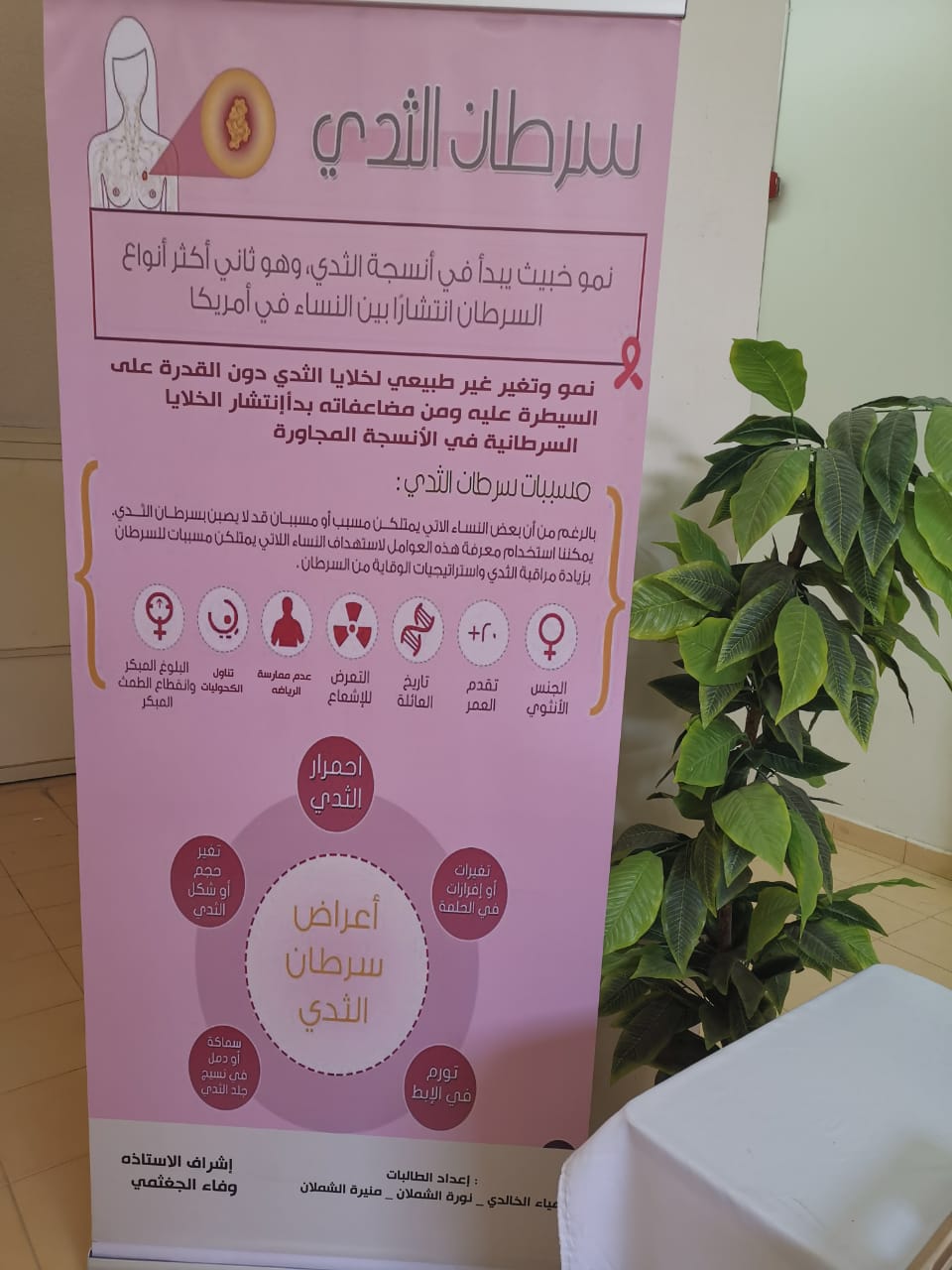 لما للجامعة من دور كبير في توعية المجتمع حول الأمراض عامة والمزمنة منها خاصة، ودورها الفعال في نشر كيفية الوقاية منها والحد من انتشارها بين الأفراد وداخل جسم الإنسان، وذلك من خلال ماتقيمه من حملات طبية توعوية، فقد أقيمت حملة طبية توعوية في عمادة السنة التحضيرية قسم الطالبات يوم الأربعاء الموافق ١٤٤١/٠٢/١٧هـ بعنوان: "لا تنتظري الأعراض، افحصي الآن " والذي جاء متزامناً مع اليوم العالمي لسرطان الثدي. ابتدأت هذه الحملة بمحاضرة توعوية قدمتها الاخصائية تهاني العمري و الدكتورة العنود خالد سليم اللاتي قدمن من مستشفى النساء والولادة والاطفال بالخرج تحدثتا فيها عن سرطان الثدي وأعراضه وكيفية تشخيصه وآلية الفحص الذاتي والوقاية منه وأنواع جراحات استئصال أورامه، كما بينتا للحاضرات أهمية الفحص المبكر. وصحب هذه الحملة معرض توعوي شاركن فيه المجلس الطلابي والنشاط الرياضي وأندية العمادة (نادي اللغة الانجليزية، نادي العلوم الأساسية، نادي تطوير الذات، نادي القراءة، عون التطوعي ونادي الابداع) كما شارك في هذا المعرض جمعية زهرة لسرطان الثدي ومجمع طبيبك الطبي. حيث اشتمل على لوحات ومجسمات ومطويات حوت معلومات مهمة ومفيدة حول الوقاية من هذا المرض كممارسة الرياضة وتناول الأغذية الصحية التي تحد وتثبط من نمو خلاياه، والبعد عن الأغذية المصنعة والسكريات لإسهامها في نموه وانتشاره. وقد تمت هذه الحملة بمشاركة طالبات العمادة، ليس بهدف توعية المجتمع فقط، بل أيضا لتشجيعهن على القراءة والابتكار والاطلاع على كل ما هو قيم ومفيد. وفي الختام تقدمت وكيلة العمادة لشؤون الطالبات الدكتورة أمل بنت صالح الشمراني بالشكر الجزيل للقائمات بهذه الحملة من منسوبات وطالبات العمادة، كما قدمت شهادات شكر وتقدير للجهات المشاركة.