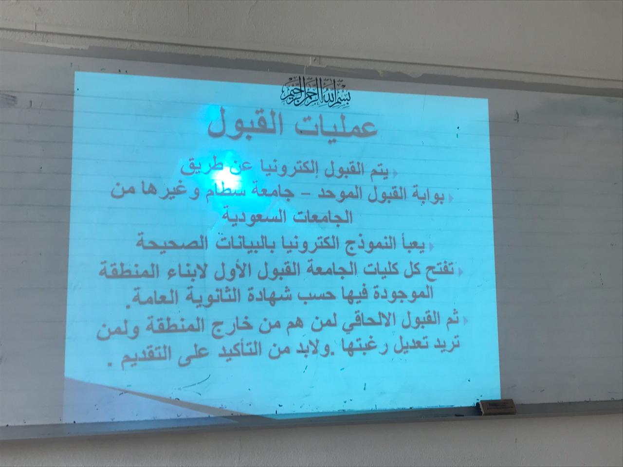 نظمت لجنة الارشاد المهني بكلية العلوم والدراسات الإنسانية بحوطة بني تميم بالتعاون مع وحدة التسجيل وشؤون الطالبات برنامج (خطوات نحو الجامعة 1) يوم الثلاثاء الموافق 21/6/1440هـ في مدرسة ثانوية التحفيظ بالحلة بمحافظة حوطة بني تميم. ركز البرنامج على توعية طالبات مرحلة الثانوية بكيفية اختيار التخصص واكتشاف الذات والتعرف على الميول المهني ونقاط القوة الخاصة بالطالبة حتى تكون الطالبة على الطريق الصحيح في تحديد التخصص في المرحلة الجامعية. الجدير بالذكر أن هذا البرنامج يأتي ضمن سلسلة من البرامج التثقيفية التي تقدمها لجنة الإرشاد المهني في الكلية في مدارس المحافظة بإعداد وإشراف الأستاذة فاطمة التاج.