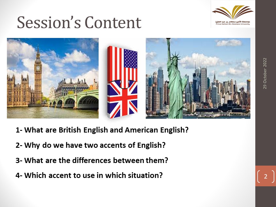 وكانت الدورة من تقديم الدكتورة بسنت مصطفى، أستاذ مساعد بقسم اللغة الإنجليزية، وقد هدفت الدورة إلى التعرف على أهم خصائص اللهجة البريطانية واللهجة الأمريكية واكتساب مهارات لغوية.