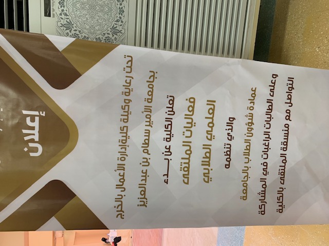 بالتزامن مع انطلاق أعمال الملتقي العلمي الثالث والذي تنظمه عمادة شؤون الطلاب ، أقامت كلية إدارة الأعمال بالخرج (قسم الطالبات) اللقاء المفتوح مع الطالبات وذلك يوم الأحد الموافق 23 / 2/ 2020، في ساحه الكلية وذلك للرد علي جميع استفسارات الطالبات وحثهم علي المشاركة في الملتقي وشرح محاور الملتقي وشروط وضوابط المشاركة ، وقد شهد هذا اللقاء إقبال العديد من الطالبات حيث قمن بتعبئة النموذج المخصص للمشاركة بالملتقى. يذكر أن اللقاء تم من خلال تنظيم المجلس الطلابي بالاشتراك مع لجنة الملتقى العلمي وبدعم من وكيله الكلية .