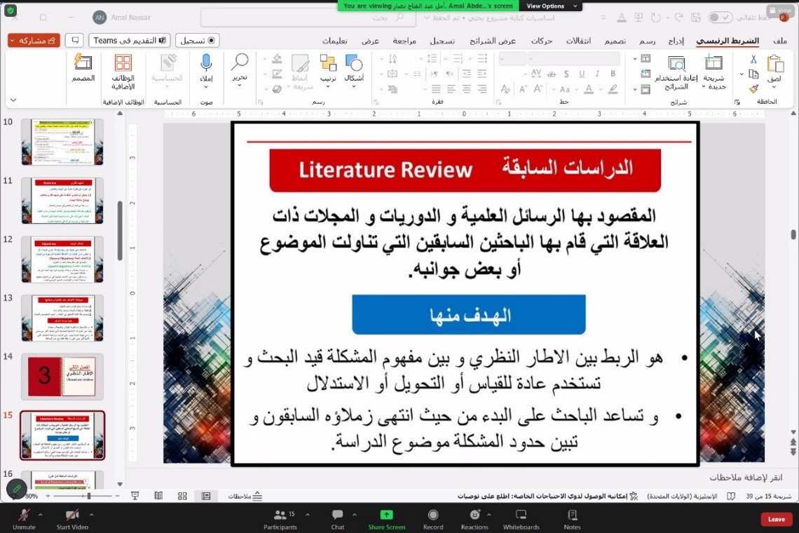 ضمن سلسلة الدورات التدريبية التي تقيمها لجنة الملتقى العلمي الطلابي بوحدة العمل الطلابي في كلية العلوم والدراسات الإنسانية بالخرج (أقسام الطالبات) قامت بعمل دورة تدريبية عن (أساسيات كتابة مشروع بحثي) ضمن محور الأبحاث العلمية أحد محاور الملتقى العلمي الطلابي وذلك يوم الأحد الموافق 26/ 5/ 1445هـ في تمام الساعة 7 مساءاً عبر برنامج زووم وقامت بتقديمها د/ أمل عبد الفتاح نصار أستاذ مساعد الكيمياء الغير عضوية.