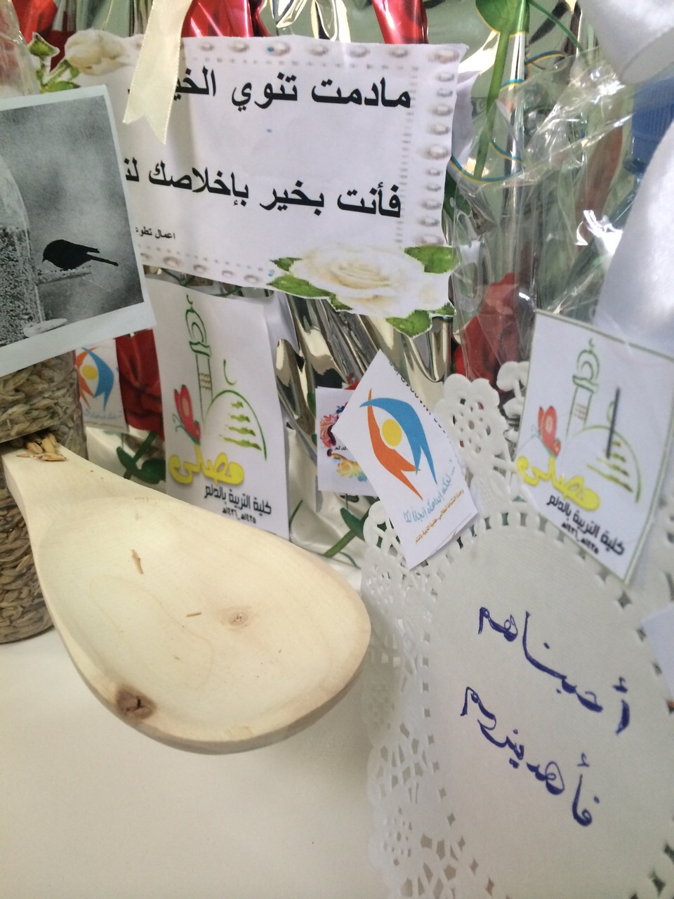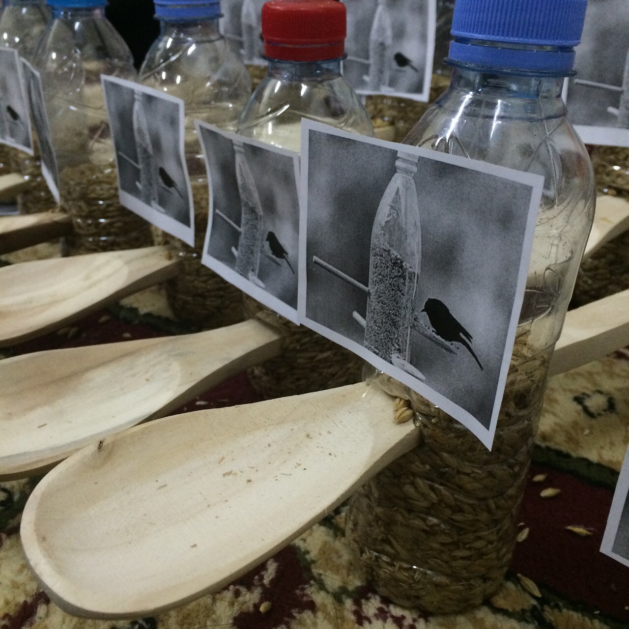 كما تم تنفيذ فكرة بسيطة من قبل الطالبات لإطعام الطيور بطريقة تحافظ على نظافة المكان، وهي عبارة عن علبة مياه فارغة أدخل في عرضها ملعقة خشبية، عند تعبئة العلبة بالحبوب يخرج جزء منها على الملعقة الخشية.