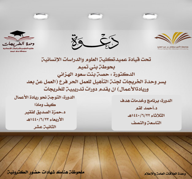 أقامت وحدة الخريجات لجنة التأهيل للعمل الحر بكلية العلوم والدراسات الإنسانية بحوطة بني تميم عدة دورات تدريبية بإشراف منسقة لجنة التأهيل للعمل الحر الدكتور أماني فرح يومي الثلاثاء والأربعاء 21-22/ 6 / 1440 هـ بمسرح الكلية عند الساعة التاسعة صباحاً. كانت الدورة الأولى عن برنامج وخدمات هدف من اعداد وتقديم الدكتور أحمد لقم لمدة ساعة ونصف حيث هدفت الدورة إلى تدريب الطالبات على استخدام البرنامج والاستفادة من خدماته. أما الدورة الثانية فركزت على مفهوم التوجه نحو عالم ريادة الاعمال والضوابط الخاصة بذلك قدمها الدكتور حمزة الصديق واستمرت لمدة ساعة ونصف.