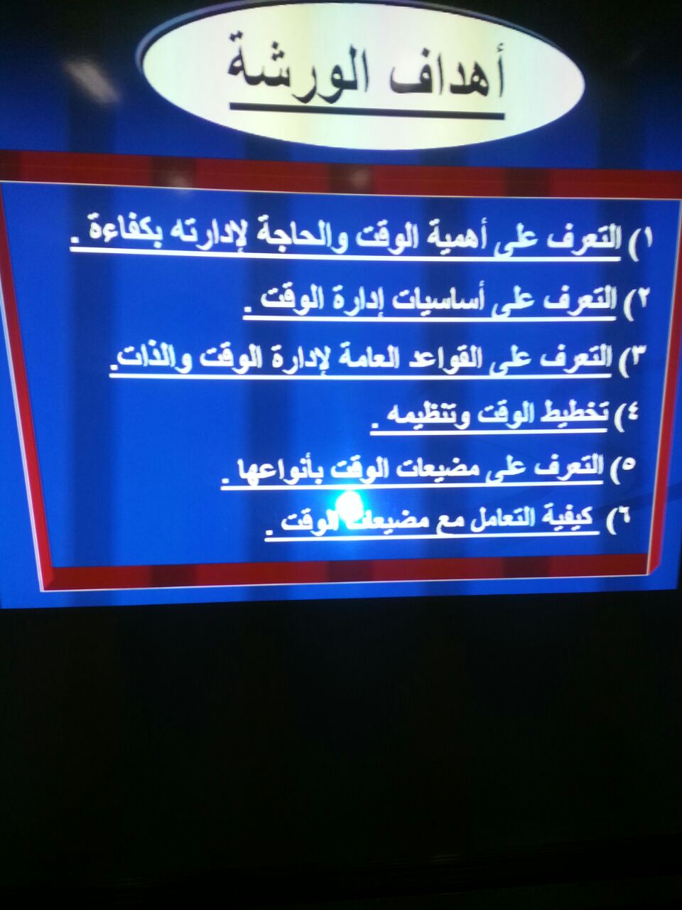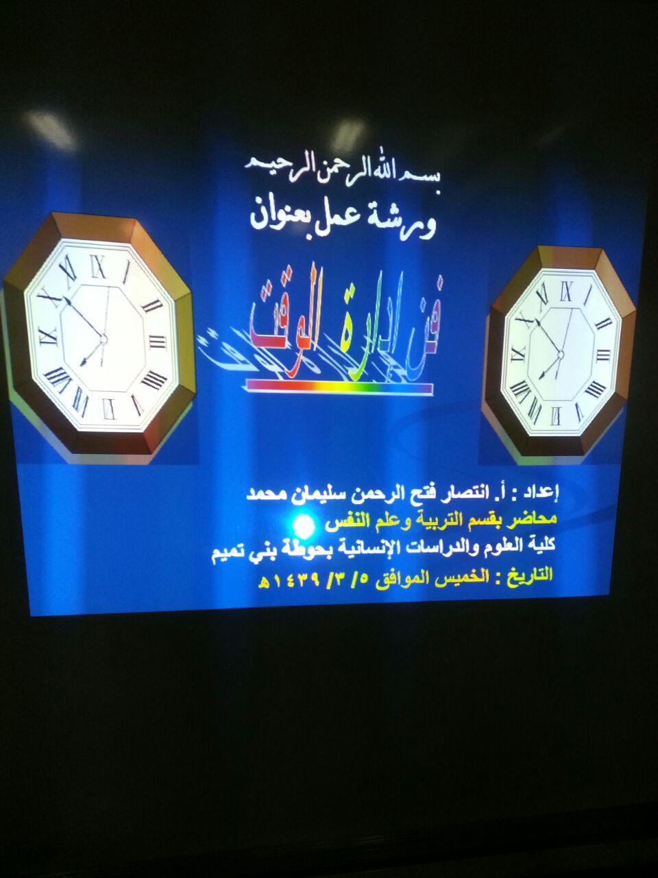 اقامت وحدة الخريجات (لجنة التطوير والتدريب) بكلية العلوم والدراسات الإنسانية بحوطة بني تميم يوم الخميس الموافق 5 /3/ 1439 هـ ورشة عمل بعنوان إدارة الوقت والتي قدمتها الأستاذة انتصار فتح الرحمن. حضر الورشة سعادة عميدة الكلية الدكتورة حصة بنت سعود الهزاني وعدد من الطالبات. استعرضت الدكتورة انتصار خلال الورشة أهمية ادارة الوقت وكيفية تنظيم الوقت ومعالجة أسباب ضياع الوقت. وقد حضر الورشة عدد كبير من طالبات.