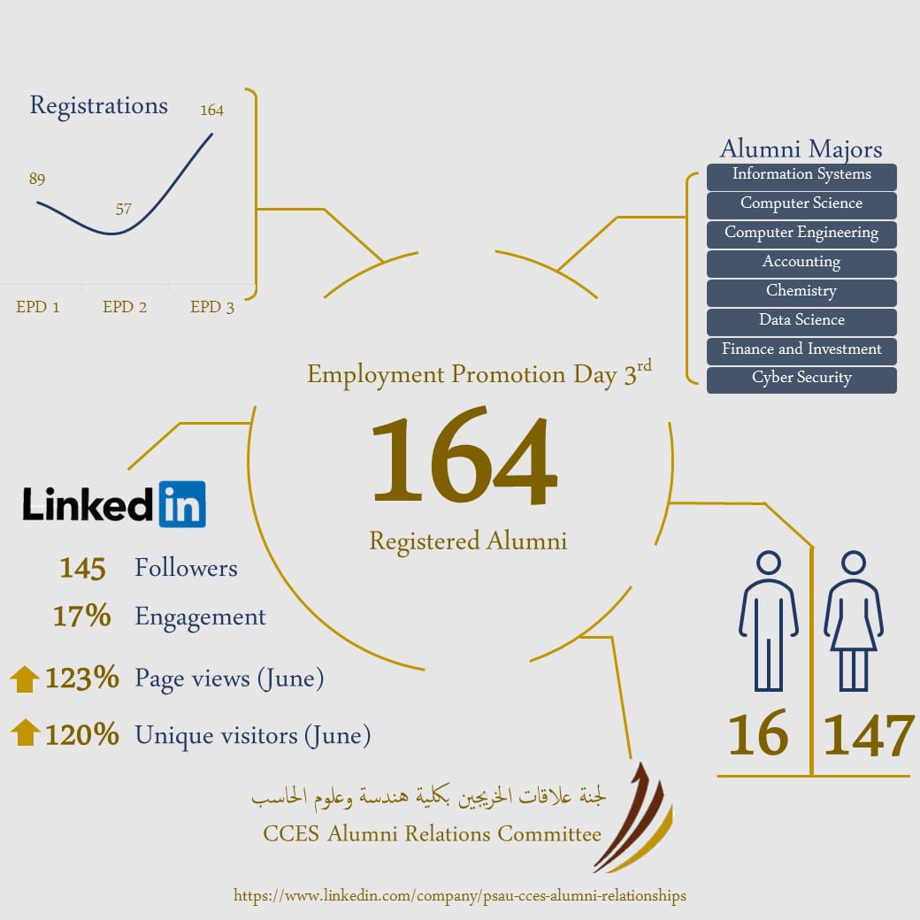 الجدير بالذكر أن برنامج يوم "التسويق الوظيفي بنسخته الثالثة" حظي بمشاركات وتنافس مشهود ما بين الطلبة الخريجين والخريجات بواقع تسجيل 164 بلغ عدد الطلاب الذكور منهم 16 فيما بلغ عدد الطالبات الإناث منهم 147 مما كان له أطيب الأثر في تسابقهم نحو القدرة والمهارة الفائقة على الأداء والالتزام والإنتاجية التي يتحلى بها خريجو كلية هندسة وعلوم الحاسب حيث شهدة الصفحة الإلكترونية الخاصة للجنة علاقات الخريجين بالكلية -https://www.linkedin.com/company/psau-cces-alumni-relationships- على نسبة تفاعل قدرت 17% بعدد 145 متابع ، ونسبة 123% مشاهد ونسبة 120% زائر جديد لها.