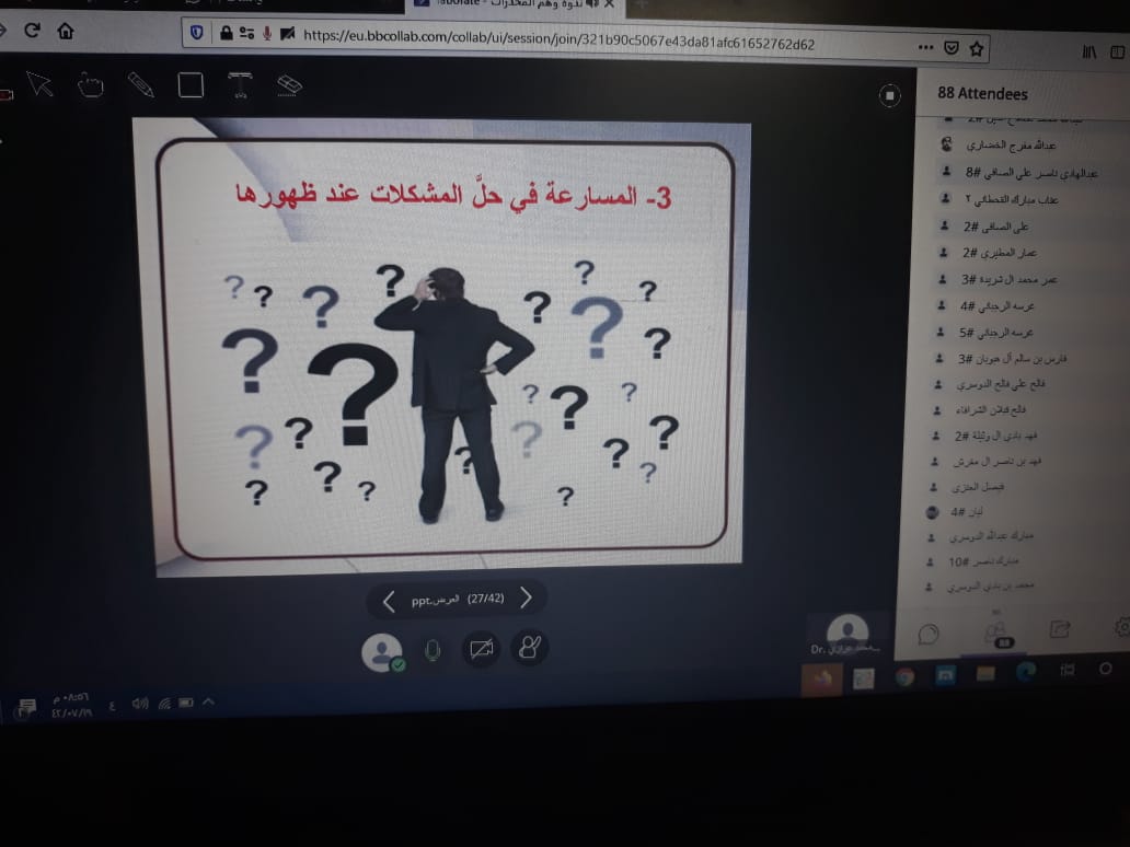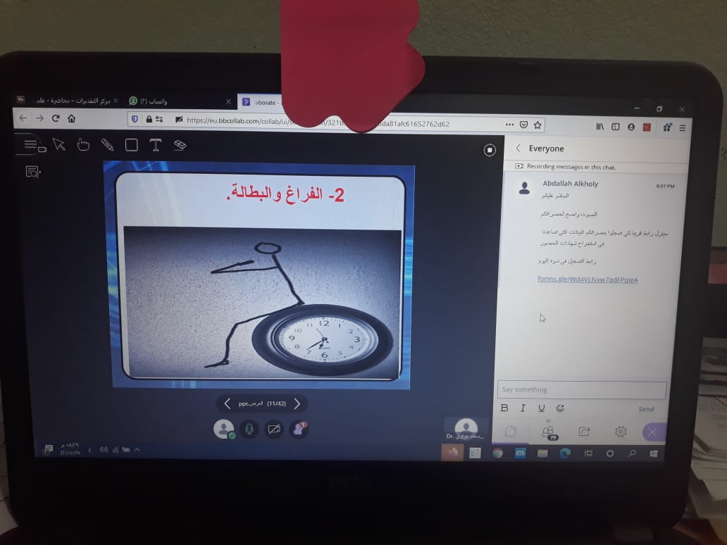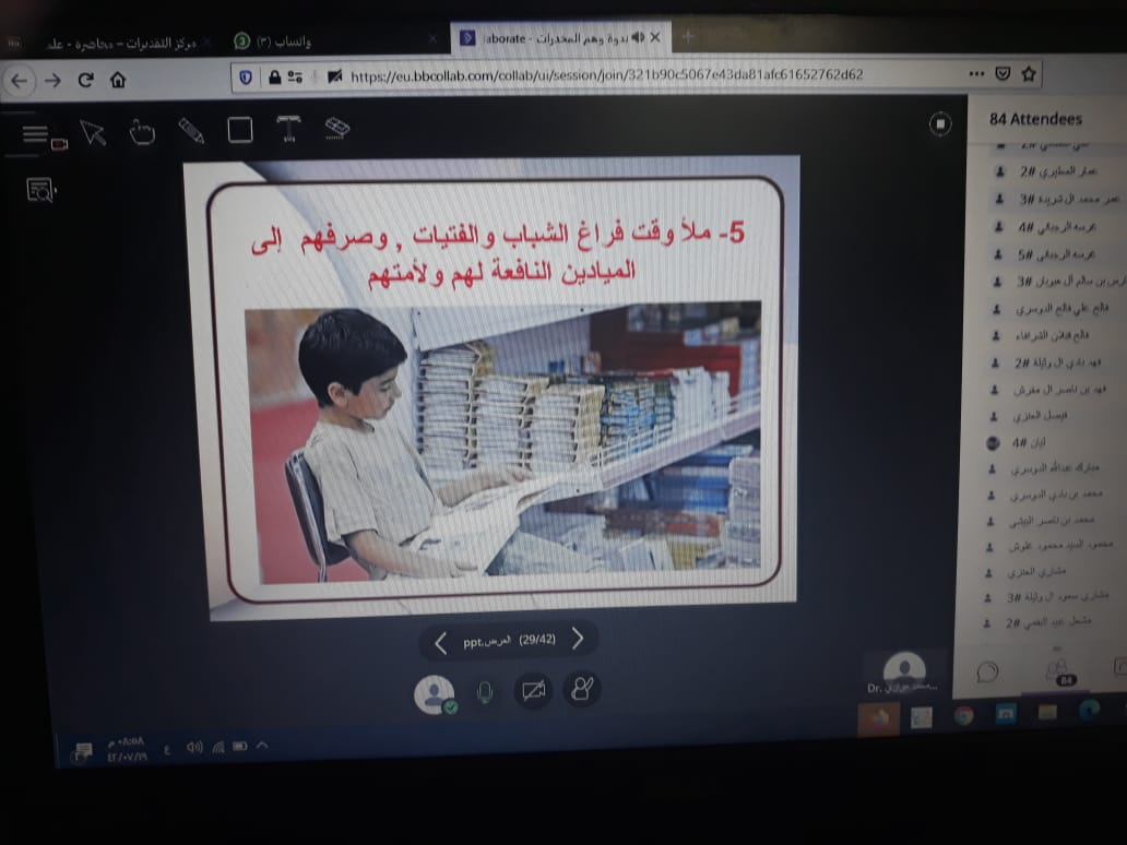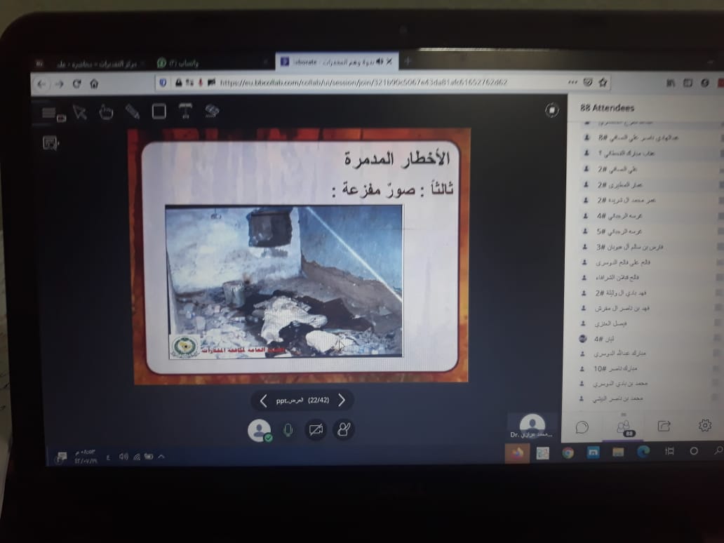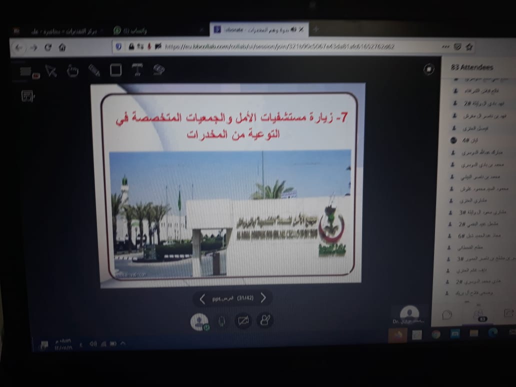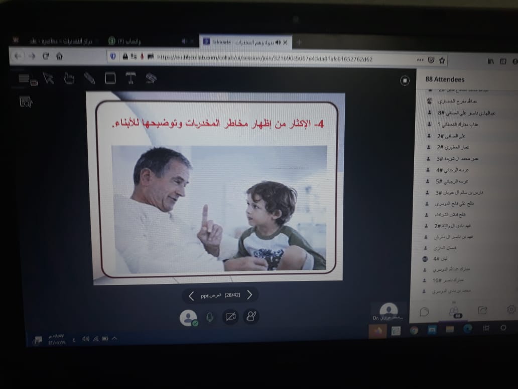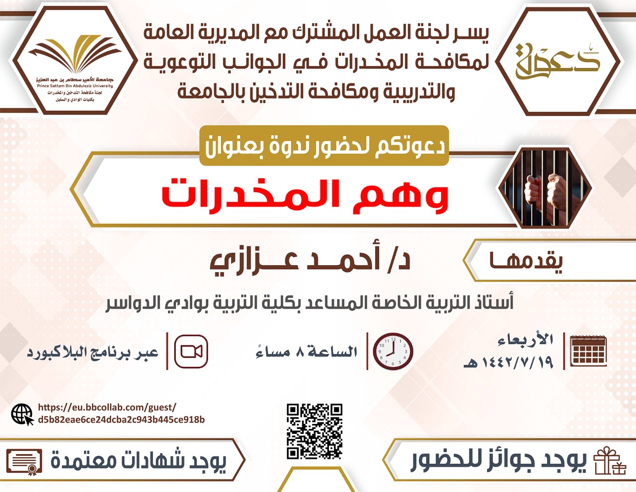 أقامت لجنة مكافحة التدخين والمخدرات بكليات الوادي والسليل ندوة بعنوان "وهم المخدرات"، وذلك يوم الأربعاء الموافق 19/7/1442، في تمام الساعة الثامنة مساءً عبر برنامج البلاكبورد، واستمرت ساعتين.