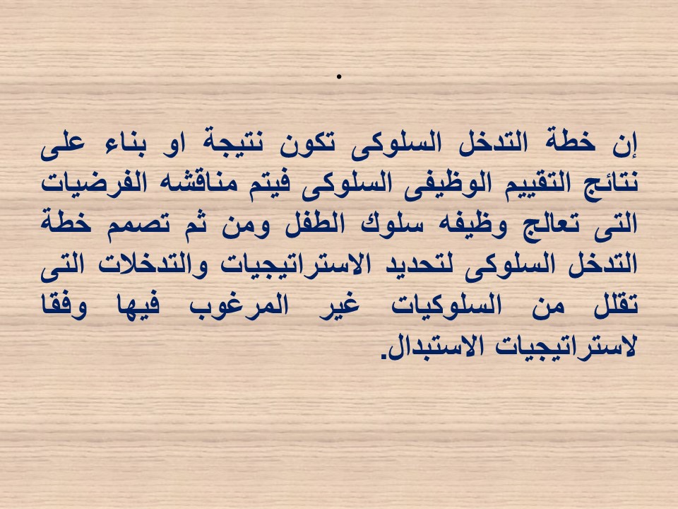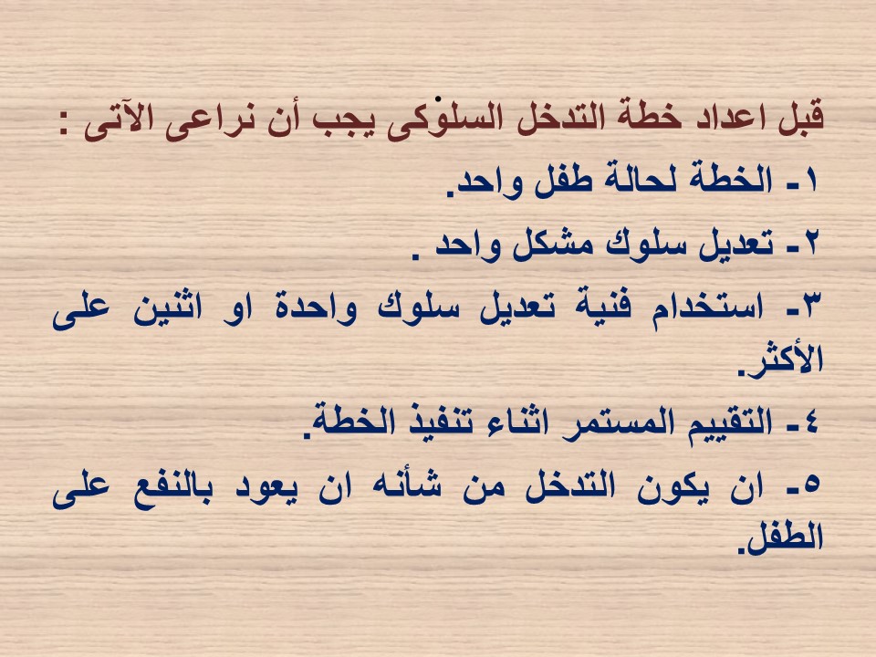 وقد اشتملت على المحاور التالية: خطة التدخل السلوكي، خطوات بناء التدخلات السلوكية، عرض العديد من الفنيات المستخدمة لتعديل سلوك الطفل، وتقييم خطة التدخل العلاجي.