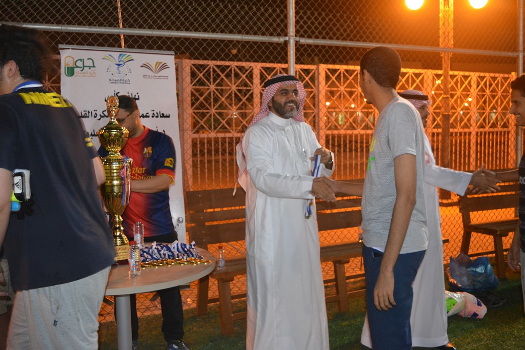 وعلى صعيد متصل قدم سعادة عميد كلية الصيدلة بجامعة الأمير سطام بن عبدالعزيز بالخرج الدكتور أحمد بن سليمان العليوي عقب تسليم جوائز البطولة التهاني والتبريكات لفريق علم الأدوية بمناسبة تحقيقهم المركز الأول وكأس البطولة , كما قدم العليوي شكره لوحدة الأنشطة الطلابية بالكلية ولكافة القائمين على النشاط الرياضي الذين واصلوا الجهد لتنظيم هذه البطولة الرائعة.