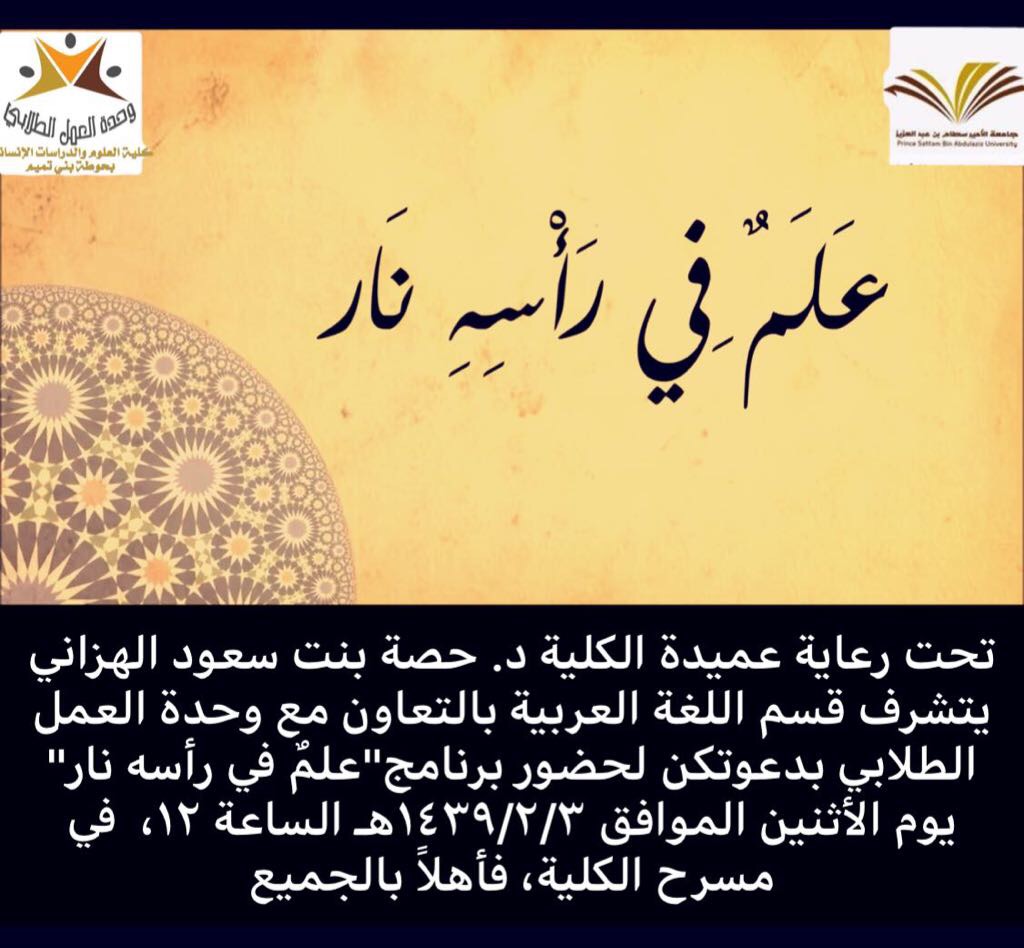 نظم قسم اللغة العربية في كلية العلوم والدراسات الإنسانية بحوطة بني تميم بالتعاون مع وحدة العمل الطلابي فعالية (علم في رأسه نار) يوم الإثنين الموافق 3/2/ 1439 هـ في مسرح الكلية. حضر الفعالية عميدة الكلية د. حصة بنت سعود الهزاني حيث بدأ العرض بذكر مراحل تطور الأدب العربي ابتداءً بالعصر الجاهلي وموضحا أهم الشعراء فيه وهم: امرؤ القيس وعنترة بن شداد، ثم انتقل إلى العصر الإسلامي يمثله حسان بن ثابت ثم العصر العباسي يمثله البحتري واختتم بالعصر الحديث مستشهدا بقصيدة المطر لبدر شاكر السياب، وأظهر البرنامج مكانة الشعر العربي وتطوره من خلال نماذج شعرية بينت تطور اللغة العربية وتكيفها مع الزمان. فالشعر ديوان العرب وخير ما يمثلها، وسيبقى (علم في رأسه نار)، وشهد البرنامج حضوراً من قبل الأعضاء والطالبات.