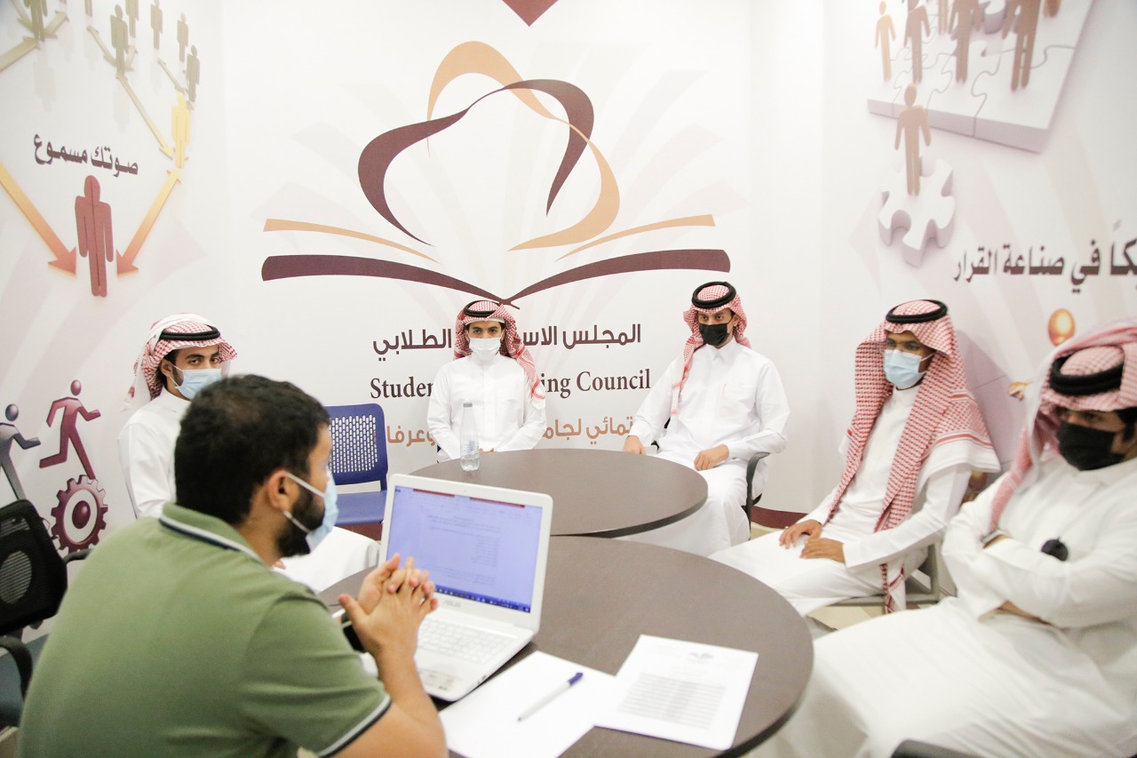 عقد المجلس الاستشاري الطلابي بكلية العلوم والدراسات الإنسانية بالأفلاج ( أقسام الطلاب ) صبيحة يوم الأحد الموافق 1443/2/26 هـ اجتماعه الأول برئاسة المشرف على وحدة الأنشطة الطلابية د.وليد علي عايدي .