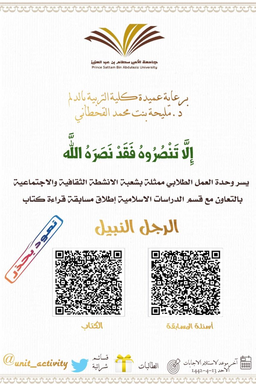 نظمت وحدة العمل الطلابي ممثلة بشعبة الأنشطة الثقافية والاجتماعية بالتعاون مع قسم الدراسات الإسلامية بالكلية لقاء بعنوان "الشخصية الأعظم في التاريخ "من إعداد وتقديم أ. هاجر الزعاقي-عضو هيئة التدريس يقسم الدراسات الإسلامية- وذلك يوم الأربعاء الموافق 18-3-1442 عبر الزوم استهدفت فيها منسوبات الكلية، ويهدف إلى: نصرة النبي صلى الله عليه وسلم وقد تضمن اللقاء ما يلي: