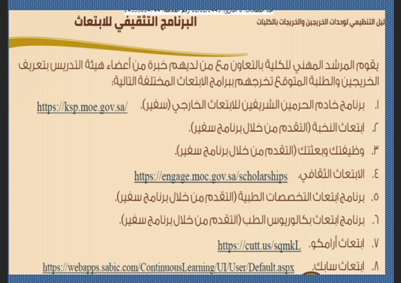 أقامت وحدة الخريجات متمثلة بالإرشاد المهني بالكلية لقاءً بعنوان" التعريف ببرامج الابتعاث الحكومي" وذلك يوم الاثنين السادس والعشرون من شهر ربيع الأول لعام 1443هـ في تمام الساعة6:30مساءً، استهدف الطالبات الخريجات والمتوقع تخرجهن، عن طريق البلاك بورد.