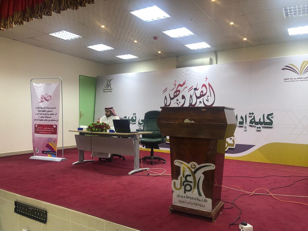 نظمت وحدة التدريب الميداني في كلية إدارة الأعمال في حوطة بني تميم لقاءً مع الطلاب الراغبين في التدريب الميداني الفصلَ القادم، وذلك في يوم الأربعاء ١٤٤١/٣/١٦هـ. وقد شارك في تقديم اللقاء أ. زيد بن محمد التمامي المحاضر في قسم نظم المعلومات الإدارية، وأ. سالم بن أحمد الشهري المحاضر في قسم المحاسبة. تضمّن اللقاء حديثًا عن أهمية التدريب الميداني، وضرورة تدريب الطالب، إضافة إلى شرح دليل التدريب الميداني، وطريقة البحث عن شركات التدريب. كما تضمّن اللقاء الحديث عن الأخطاء الشائعة التي يقع فيها بعض الطلاب عند التدريب، وآليات المتابعة والتقارير.