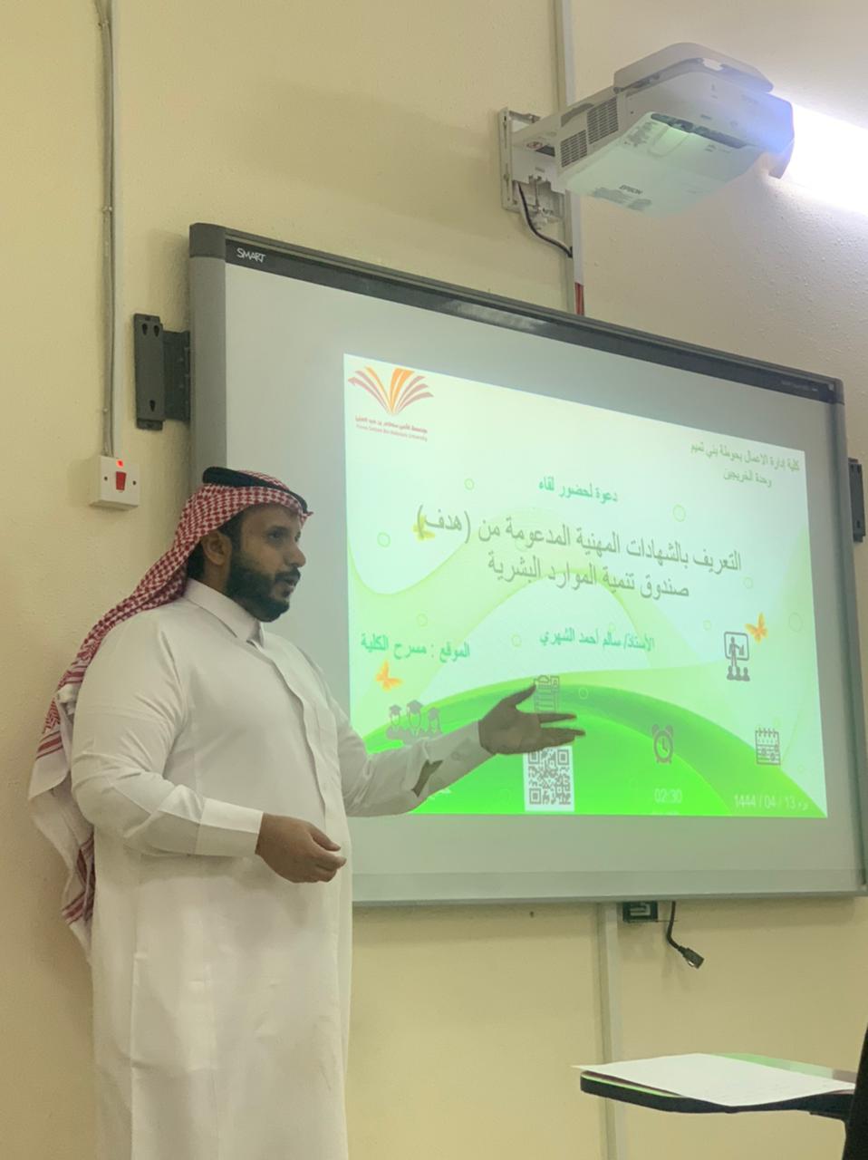 أقامت وحدة الخريجين ممثلة بلجنة تنمية المهارات المهنية لقاءً يستهدف الطلاب الخرّيجين؛ للتعريف ببرنامج الشهادات المدعومة (هدف) صندوق تنمية الموارد البشرية، قدمه أ. سالم الشهري المحاضر في قسم المحاسبة بالكلية، يوم الاثنين ١٤٤٤/٤/١٣هـ.