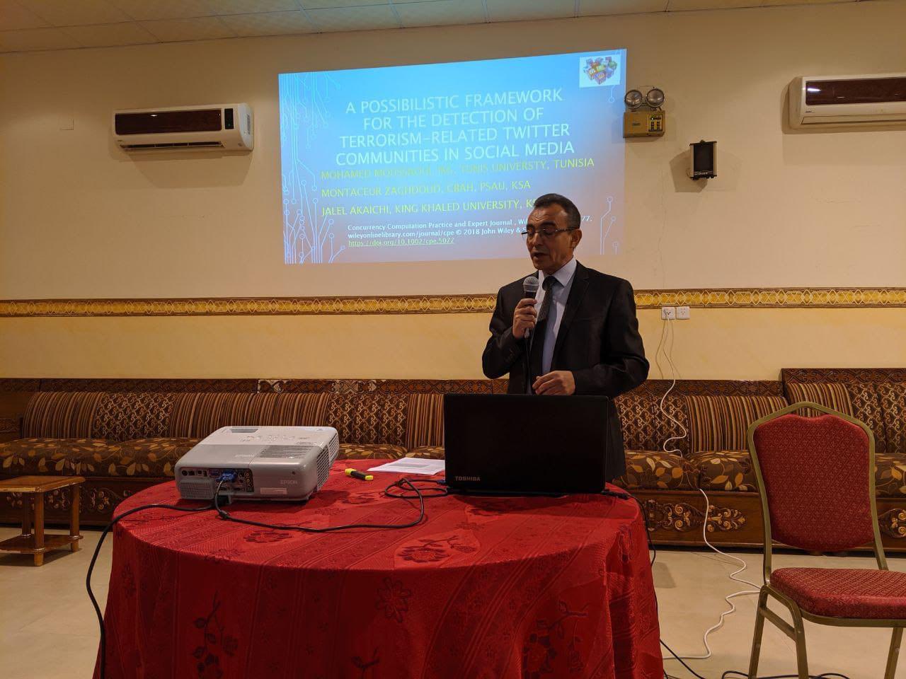 أما ورقة العمل الثانية فكانت تحت عنوان: (نظام لرصد أنشطة الجماعات المتطرفة في مواقع التواصل الاجتماعي)، وقد تحدث فيها د. المنتصر زغدود عن تطوير نظام رصد أنشطة الجماعات المتطرفة في مواقع التواصل الاجتماعي من خلال التنقيب في قواعد البيانات الضخمة الخاصة بالمواقع الاجتماعية، وتصنيف أعضاء المواقع الاجتماعية بالنظر إلى نوع الخطاب المتداول بينهم، إضافة إلى تتبّع الروابط التي تجمع أعضاء الجماعات المتطرفة، ورصد أنشطتهم.
