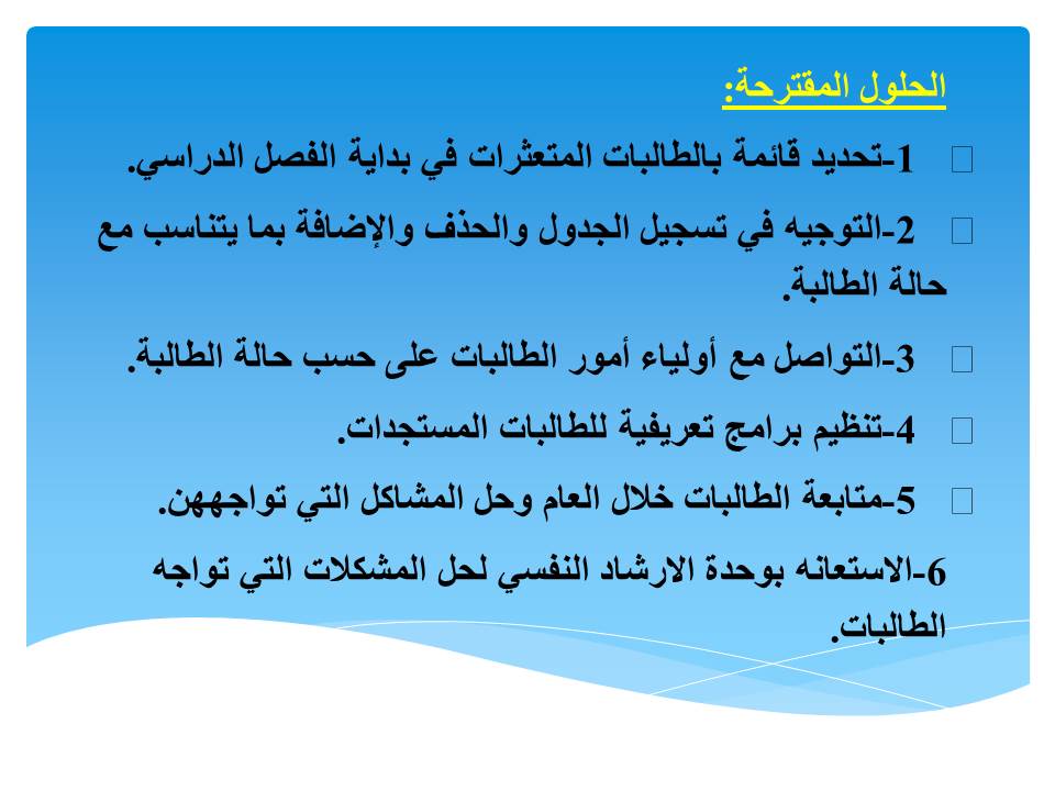 تحت رعاية وكيلة الكلية د. خولة الصفار قامت مشرفة وحدة الإرشاد الأكاديمي أ/ داليا فوزي وبحضور كلاً من د.صفية القحطاني مشرفة وحدة الشؤون التعليمية والأكاديمية ومنسقة وحدة الإرشاد النفسي وكذلك بحضور منسقات الإرشاد الأكاديمي بالأقسام في اللقاء مع الطالبات المتعثرات على مستوى الكلية وذلك يوم الثلاثاء الموافق 4 / 6 / 1439هـ تضمن اللقاء محاور عدة منها الوقوف على أسباب الفصل من الجامعة ومتى يسمح للطالبة بإعادة القيد ، كما تم خلال اللقاء مناقشة أسباب التعثر لدى الطالبات مع وكيلة الكلية مع حثهن على الجدية وبذل الهمم في تجاوز التعثر من خلال الاستعانة بالله أولا ثم النظر إلى مشكلاتهن نظرة موضوعية تمكنهن من الوصول إلى أهدافهن كما حثتهن على الاستفادة من خدمات الكلية في الارشاد النفسي والأكاديمي .