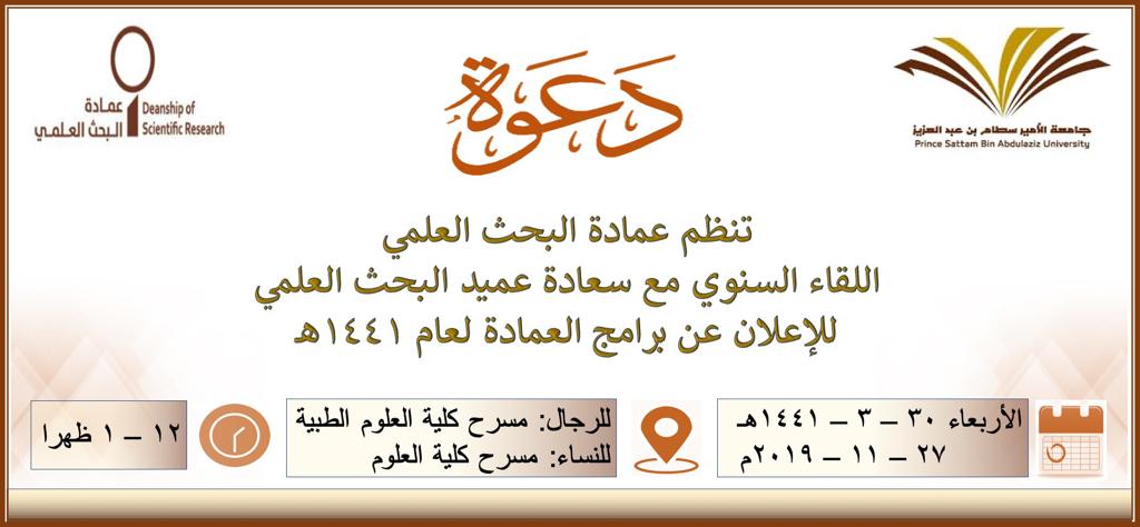 يسر عمادة البحث العلمي أن تتوجه بالدعوة العامة لكافة أعضاء هيئة التدريس بالجامعة لحضور لقاء العمادة السنوي المفتوح، حيث سيتم الاعلان، عن البرامج التي اعتمدها مجلس العمادة لهذا العام 1440/1441هـ لاستقبال المقترحات البحثية عليها، مع التطرق لآلية المفاضلة بين المتقدمين ولأبرز المشكلات التي تعترض سبيلهم حين التقدم بمقترحاتهم وسبل التغلب عليها، إضافة إلى الاستماع لآراء ومقترحات الزملاء أعضاء هيئة التدريس. علماً بأن اللقاء سيتم في تمام الساعة الثانية عشرة ظهرا يوم الأربعاء 30/3/1441هـ الموافق 27/11/2019م، بمسرح كلية العلوم الطبية التطبيقية (مبنى 5) للرجال ومسرح كلية العلوم للنساء، وسيتم ربط الشبكي بجميع فروع الجامعة الأخرى.
