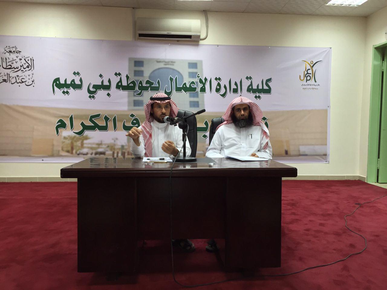 بتنظيم من وكالة كلية إدارة الأعمال في حوطة بني تميم للشؤون التعليمية والأكاديمية التقى عميد الكلية الدكتور خالد بن عبدالله العتيبي بحضور وكيل الكلية للشؤون التعليمية والأكاديمية الدكتور إبراهيم بن محمد الداود مع الطلاب وذلك في يوم الأربعاء 18-11-1436هـ وفي بداية اللقاء رحب عميد الكلية بالطلاب، وهنأهم بالعام الجامعي الجديد، راجيًا لهم فيه التفوق والنجاح وقد وضح الدكتور خالد العتيبي رؤية تطوير الكلية، مبيِّنًا الخطوات العملية، وأهمية دور الطلاب الفاعل في ذلك كما تناول في حديثه الخطة الدراسية للأقسام، ومتطلبات كل